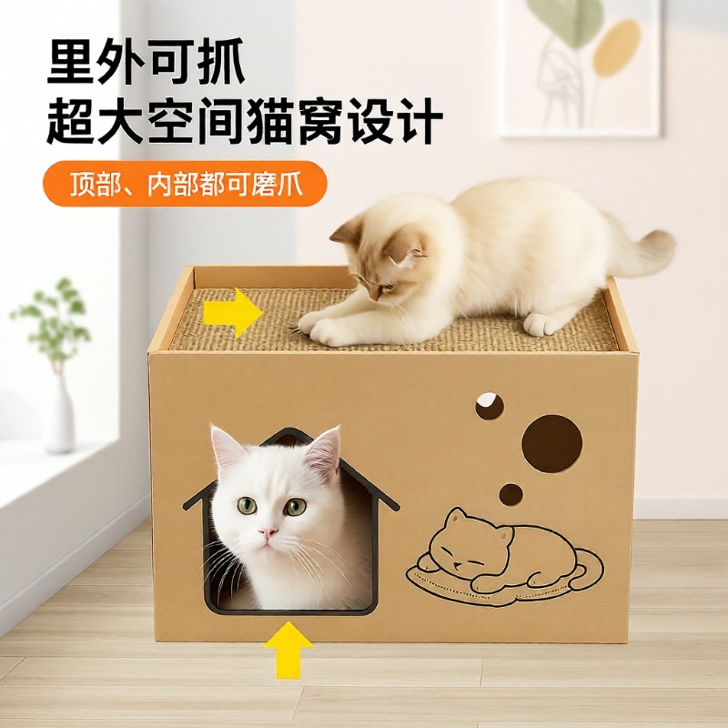 双层猫咪纸箱屋瓦楞纸猫窝猫抓板窝耐磨一体猫房子大号多猫封闭式