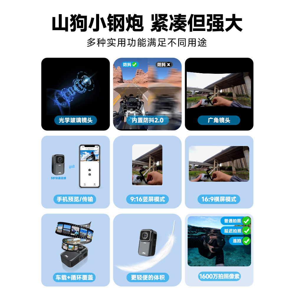 山狗A7运动相机 摩托车行车记录仪4K头盔钓鱼Vlog非360全景摄像机