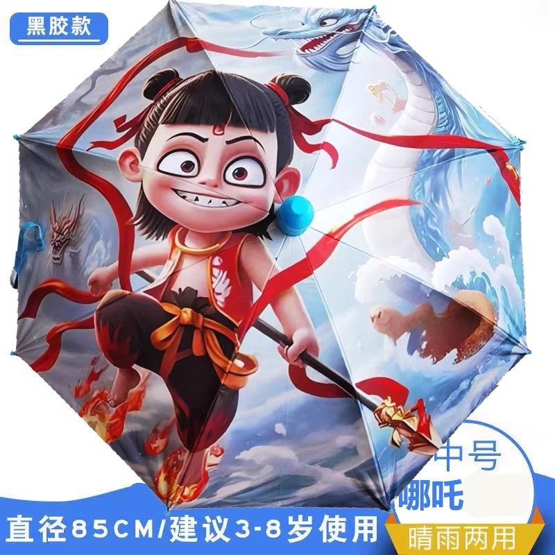 哪吒熬丙卡通按动伞自动弹安全男童黑胶便携小学生晴雨伞两用儿童