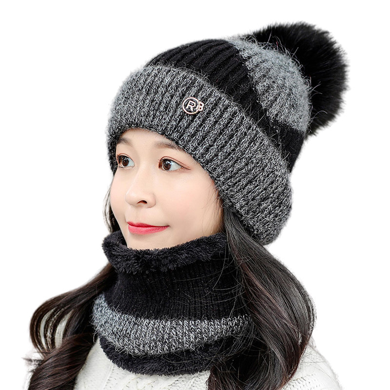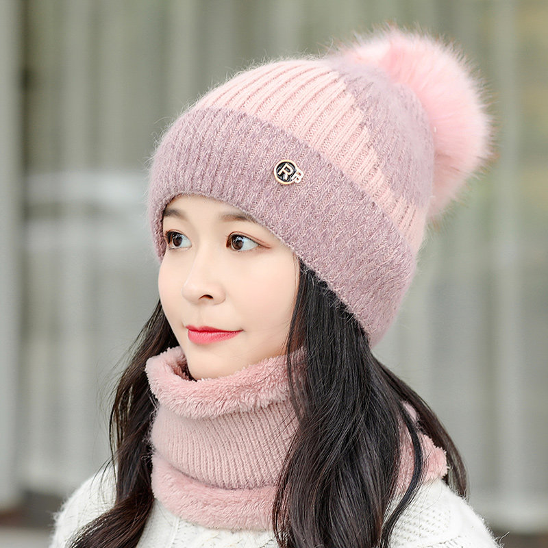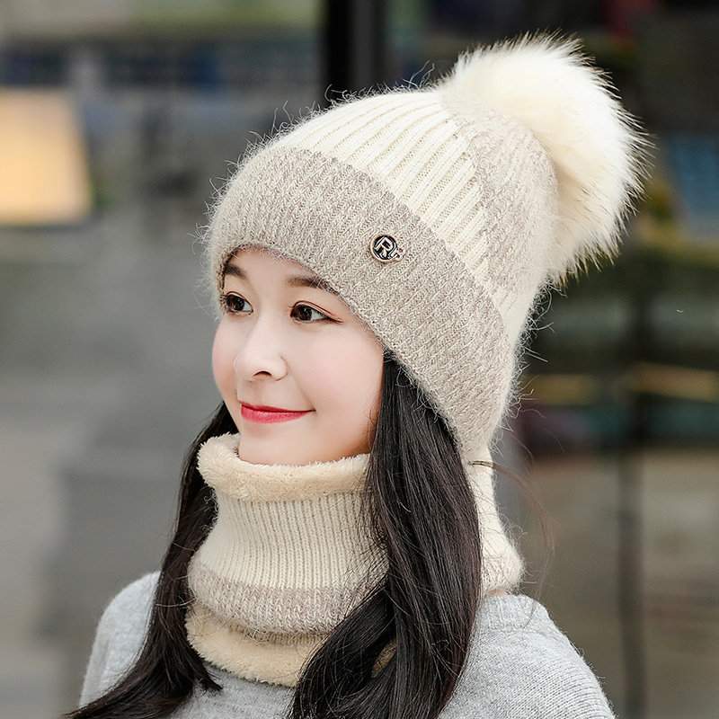 帽子女士冬天加绒骑车防寒秋冬季毛线月子帽保暖围脖护耳针织白色