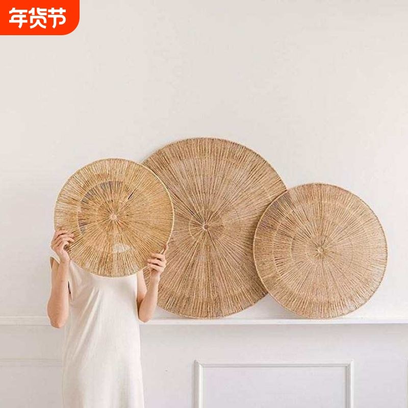 新中式圆形藤编墙面遮丑装饰民宿网红店餐厅客厅背景墙复古风壁饰