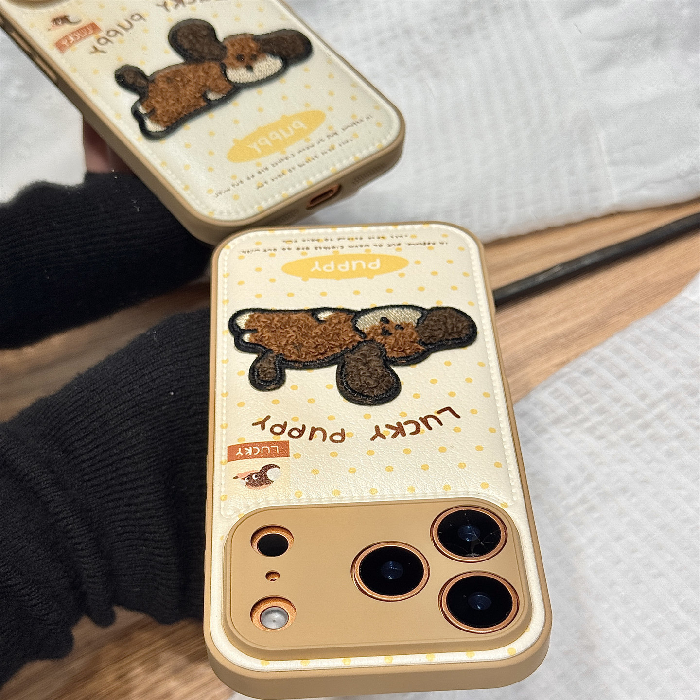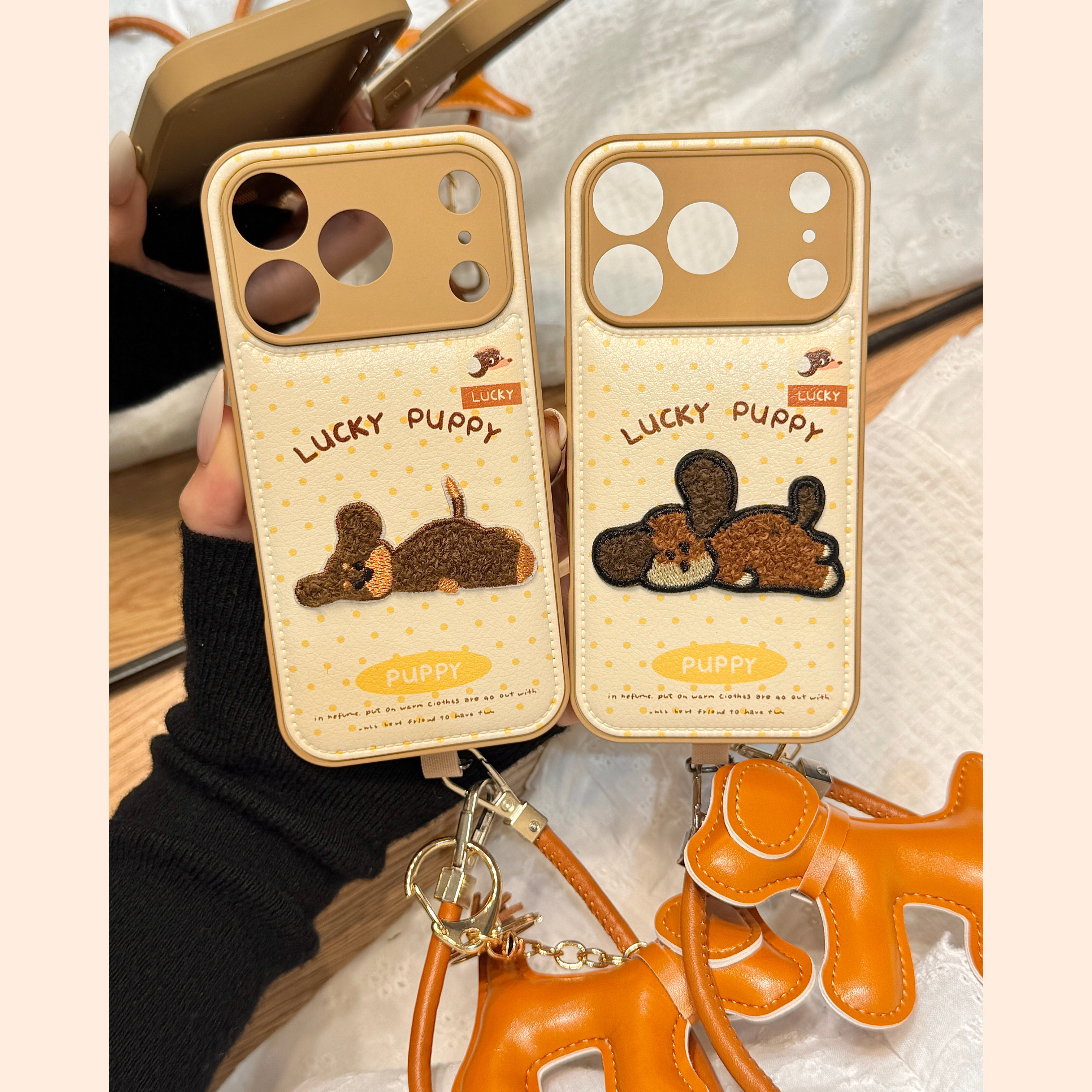 棕色刺绣狗狗皮纹鼓包大视窗手拎绳适用于iphone17promax苹果14手机壳15新款16pro女13可爱17pm情侣款防摔套