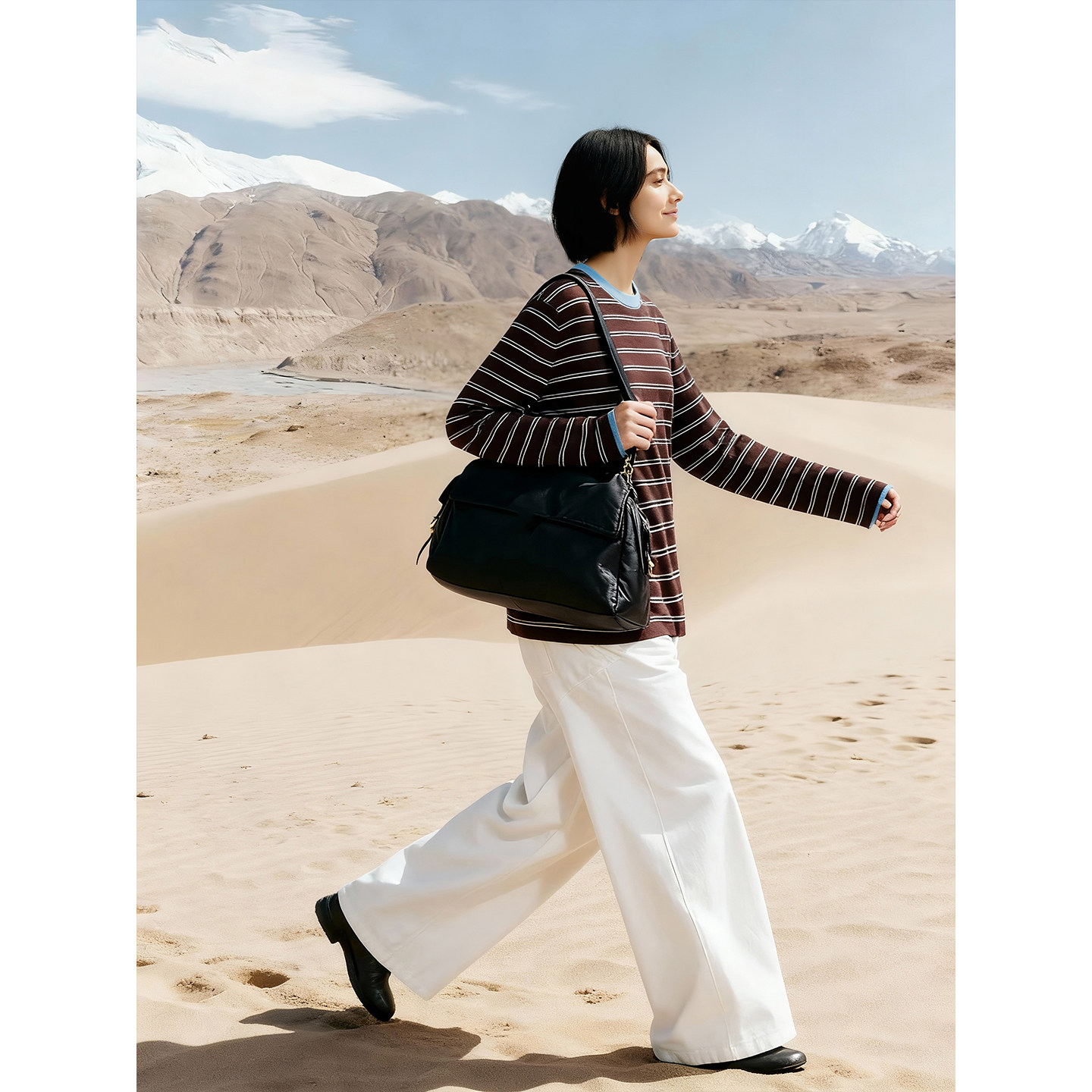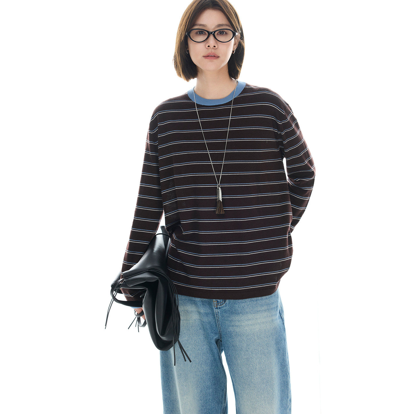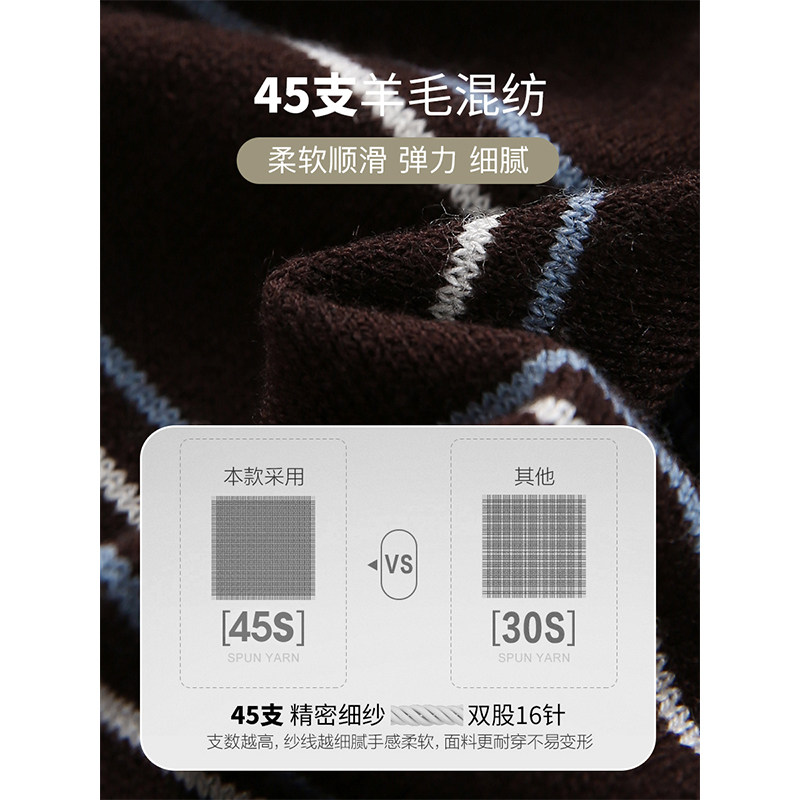云上生活【织梦】丝光羊毛撞色条纹针织衫女2025秋季显瘦落肩上衣