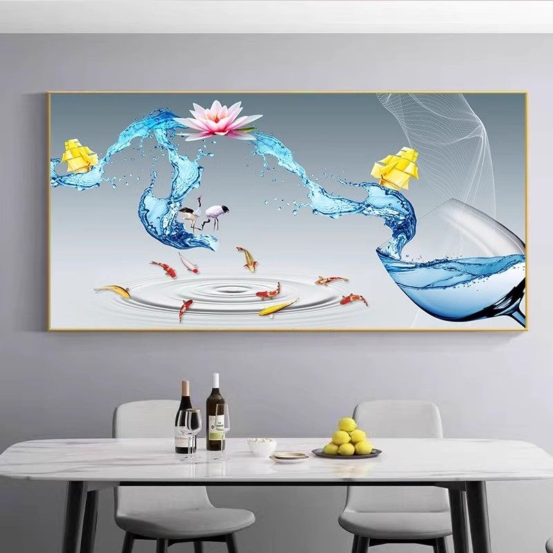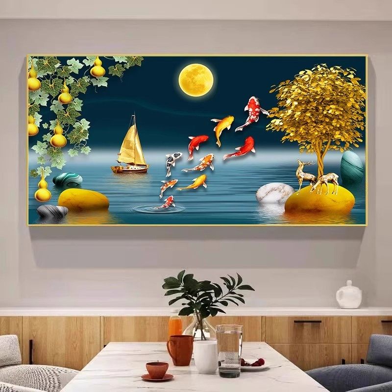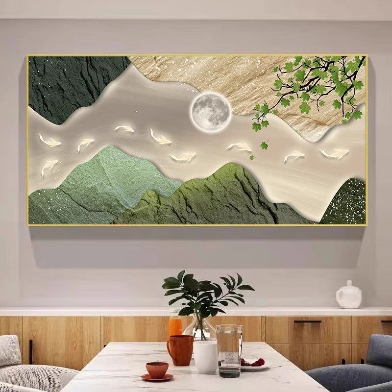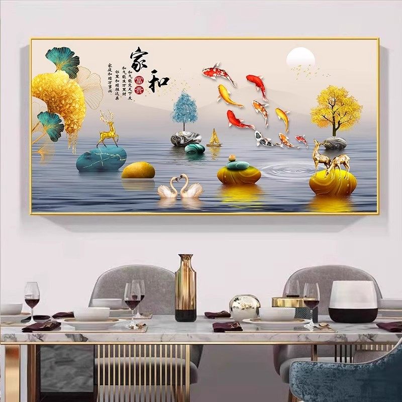 招财九鱼图餐厅装饰画吃饭厅新中式饭桌高档挂画餐桌背景墙面壁画