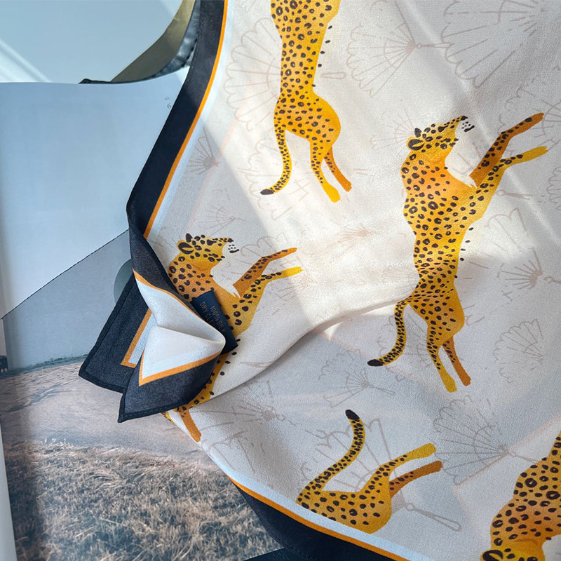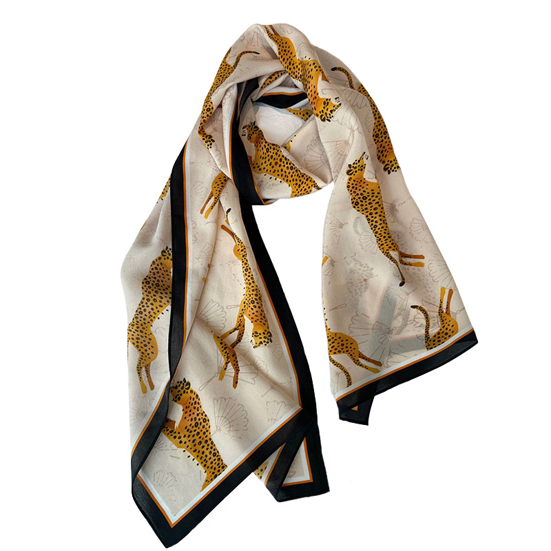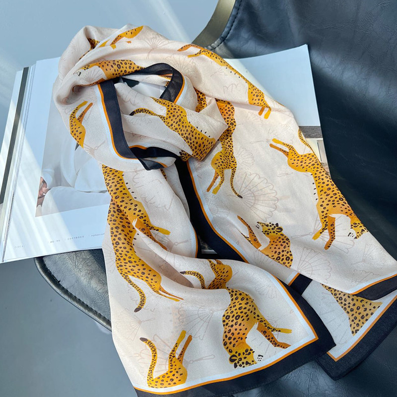 “金钱抱”豹子真丝米色薄款围巾女秋季显白蚕丝洋气长条丝巾发带