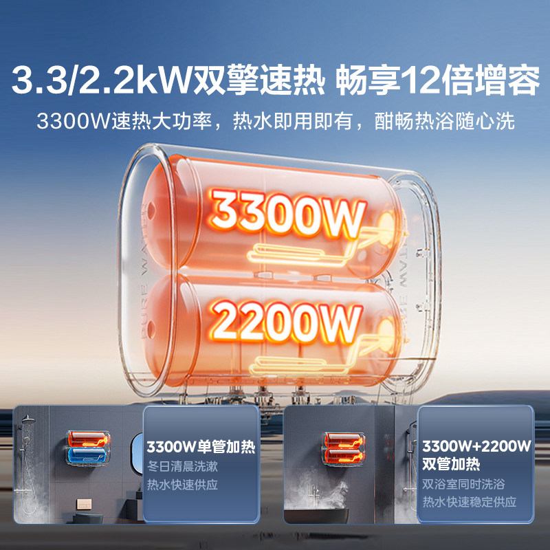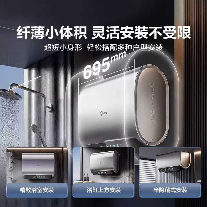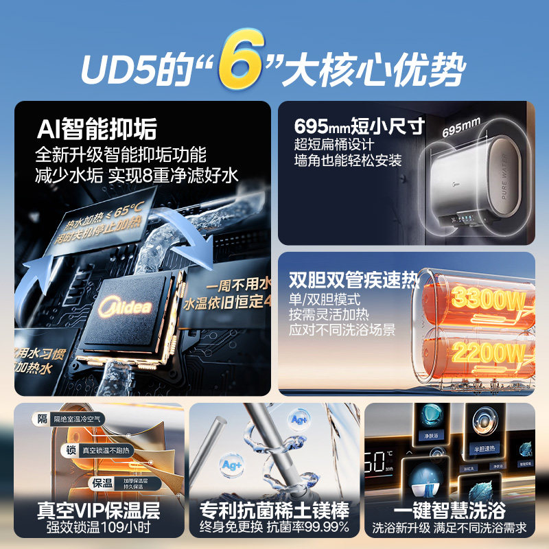 美的扁桶电热水器双胆速热家用洗澡卫生间超短60/80升大容量UD5