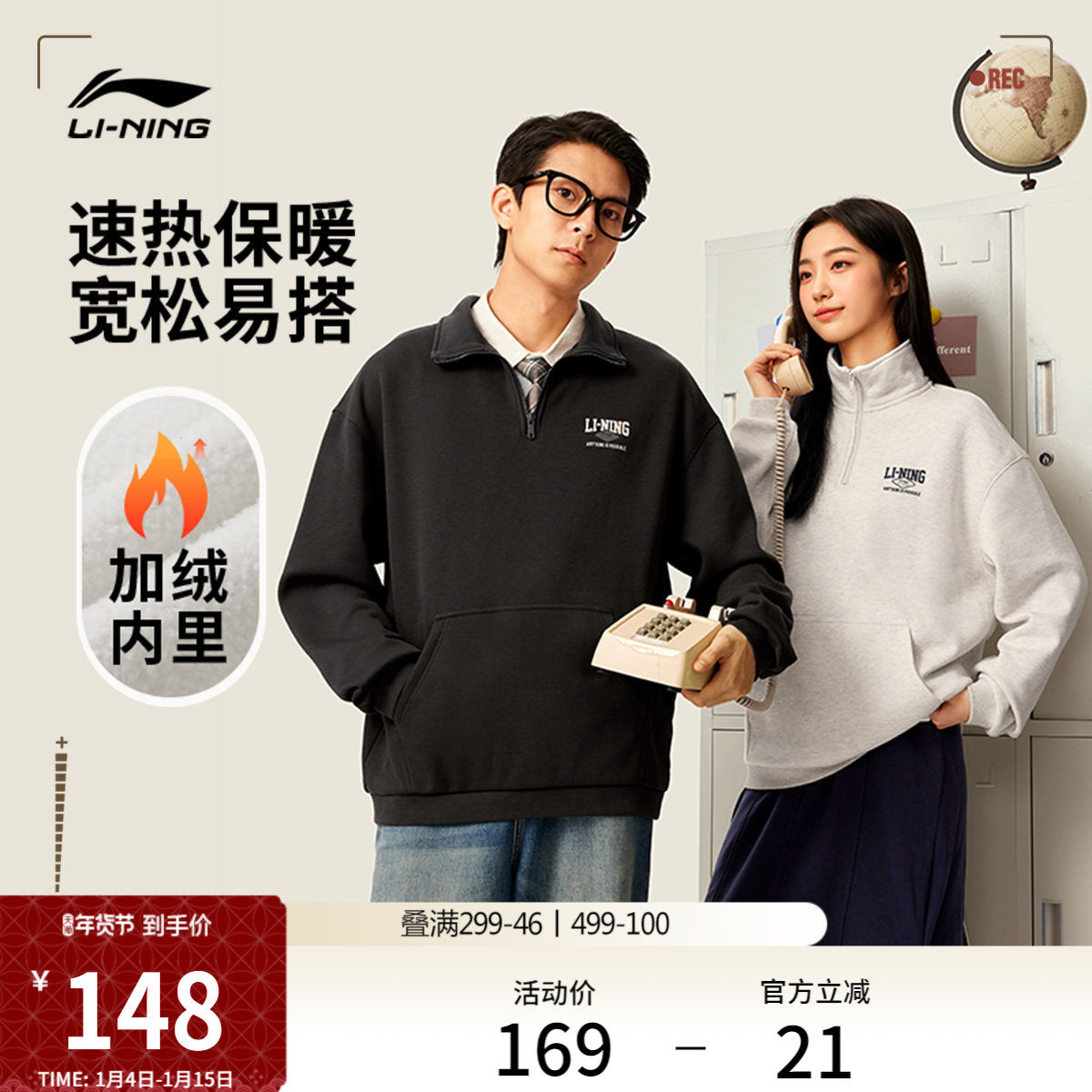 李宁加绒半拉链卫衣女冬季官方新款情侣无帽上衣美式宽松运动服男