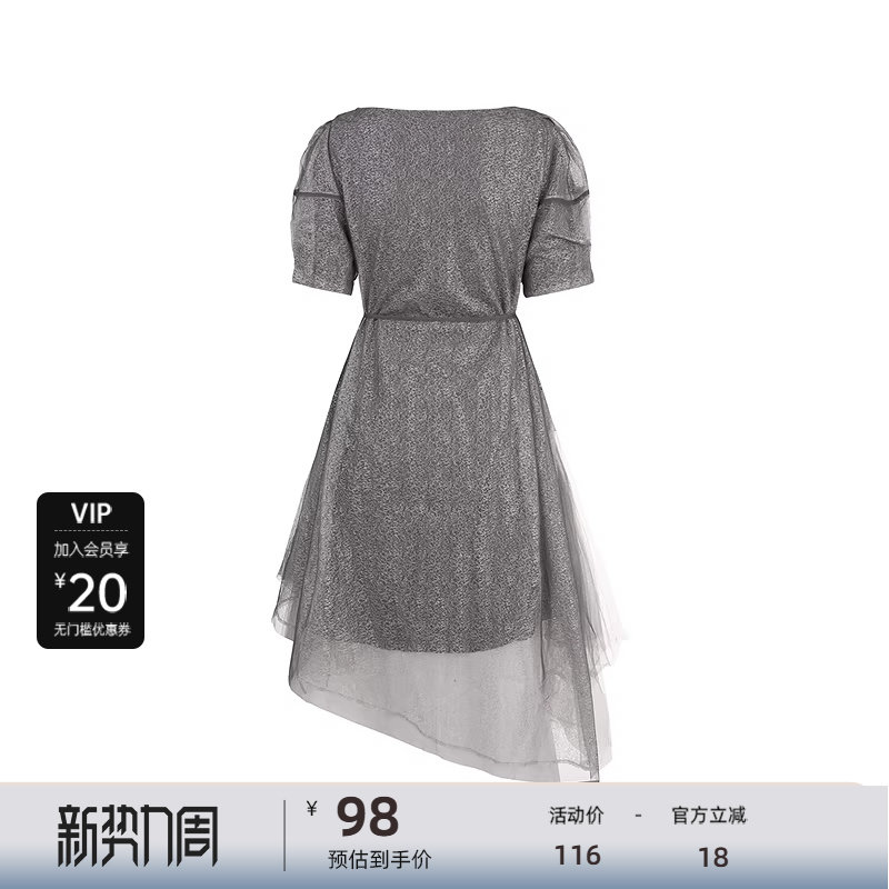 sdeer圣迪奥女装圆领肌理网纱收腰泡泡袖连衣裙S223Z12H2