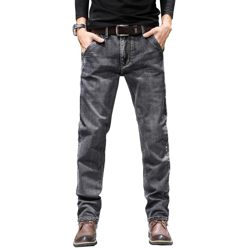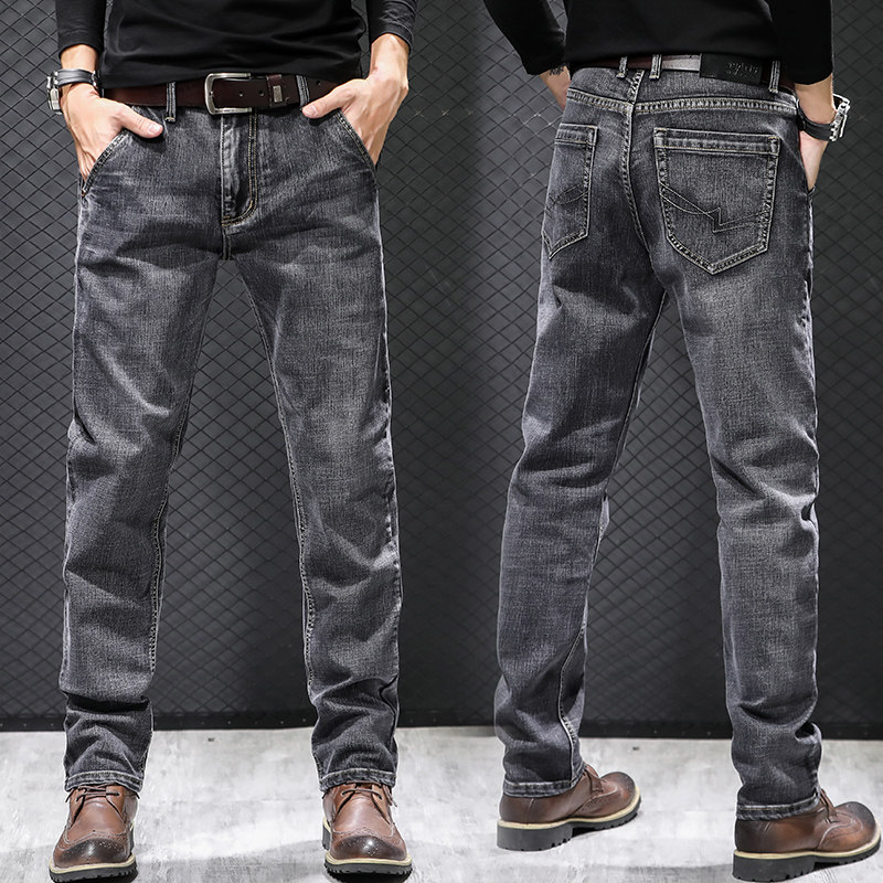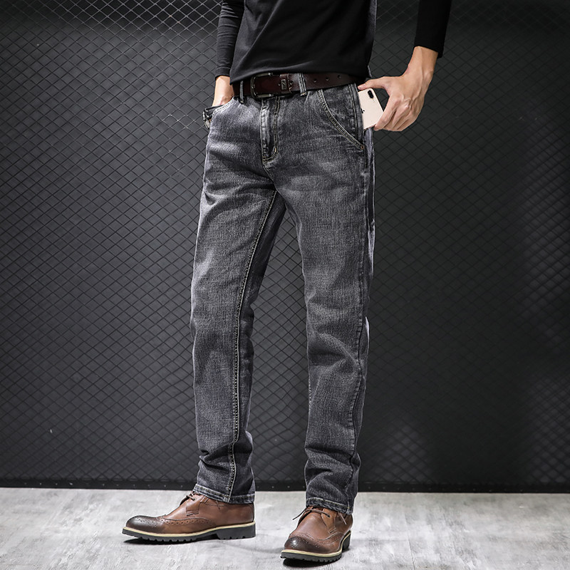 秋冬厚款灰色柔软男士牛仔裤多口袋防盗拉链大码宽松高腰弹力直筒