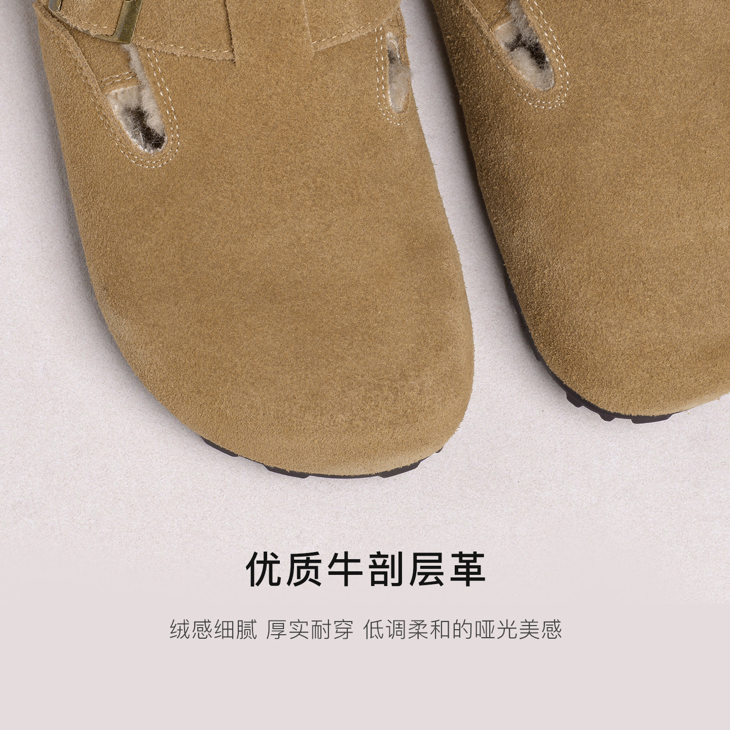 磨砂牛皮松糕厚底大头勃肯鞋女复古真皮圆头增高一脚蹬懒人毛毛鞋