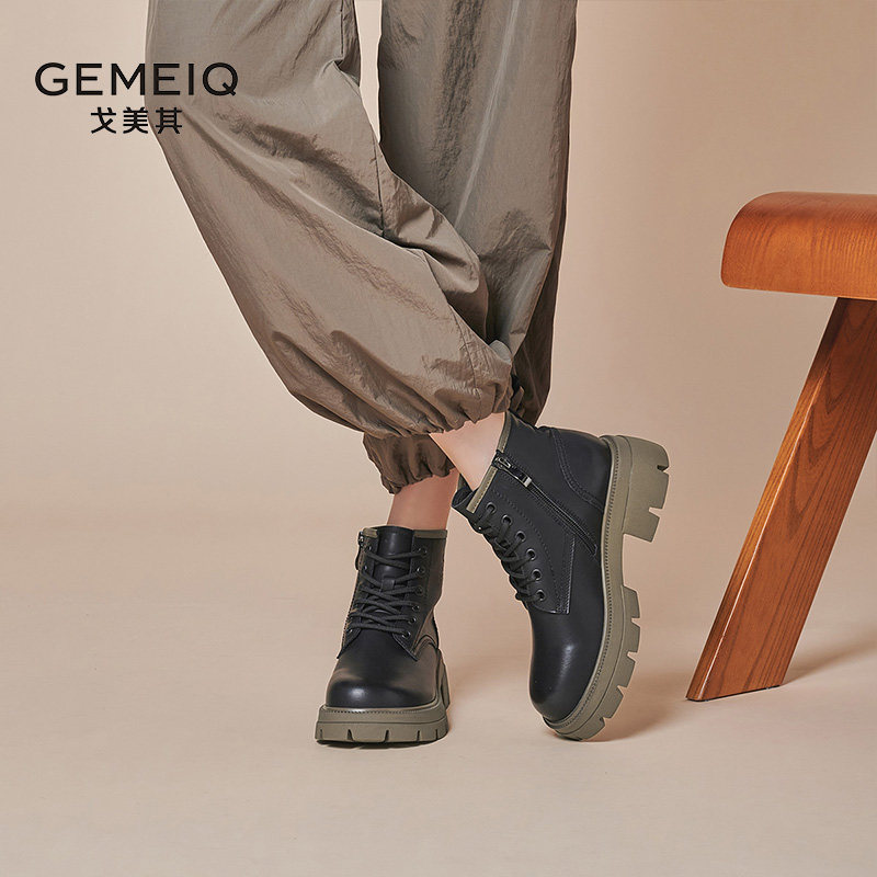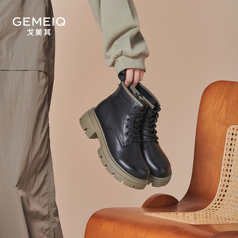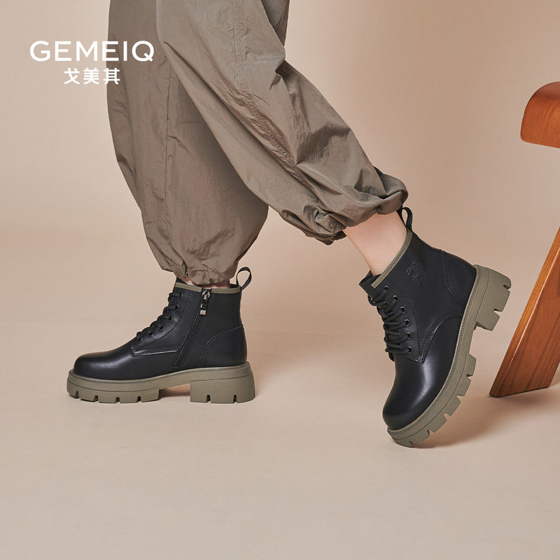 戈美其真皮马丁靴女厚底春秋单靴舒适新款系带黑色增高英伦风短靴
