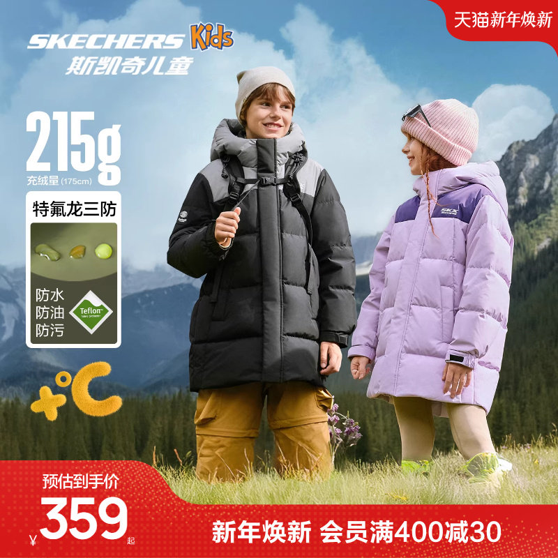 Skechers斯凯奇小暖宝2.0儿童冬季中长款羽绒外套三防保暖羽绒服