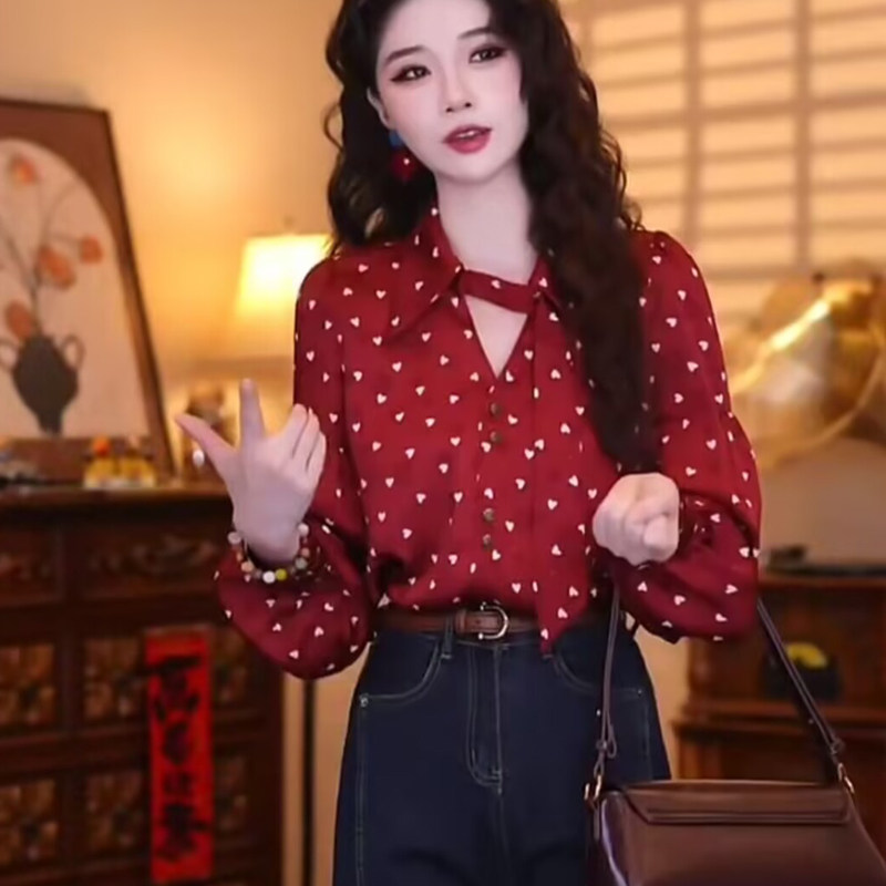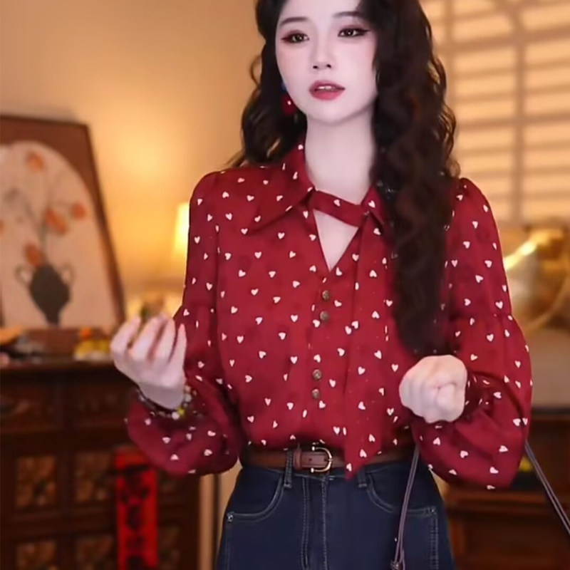 怀旧复古港风chic别致上衣春秋法式红色衬衫女长袖打底潮时髦小衫