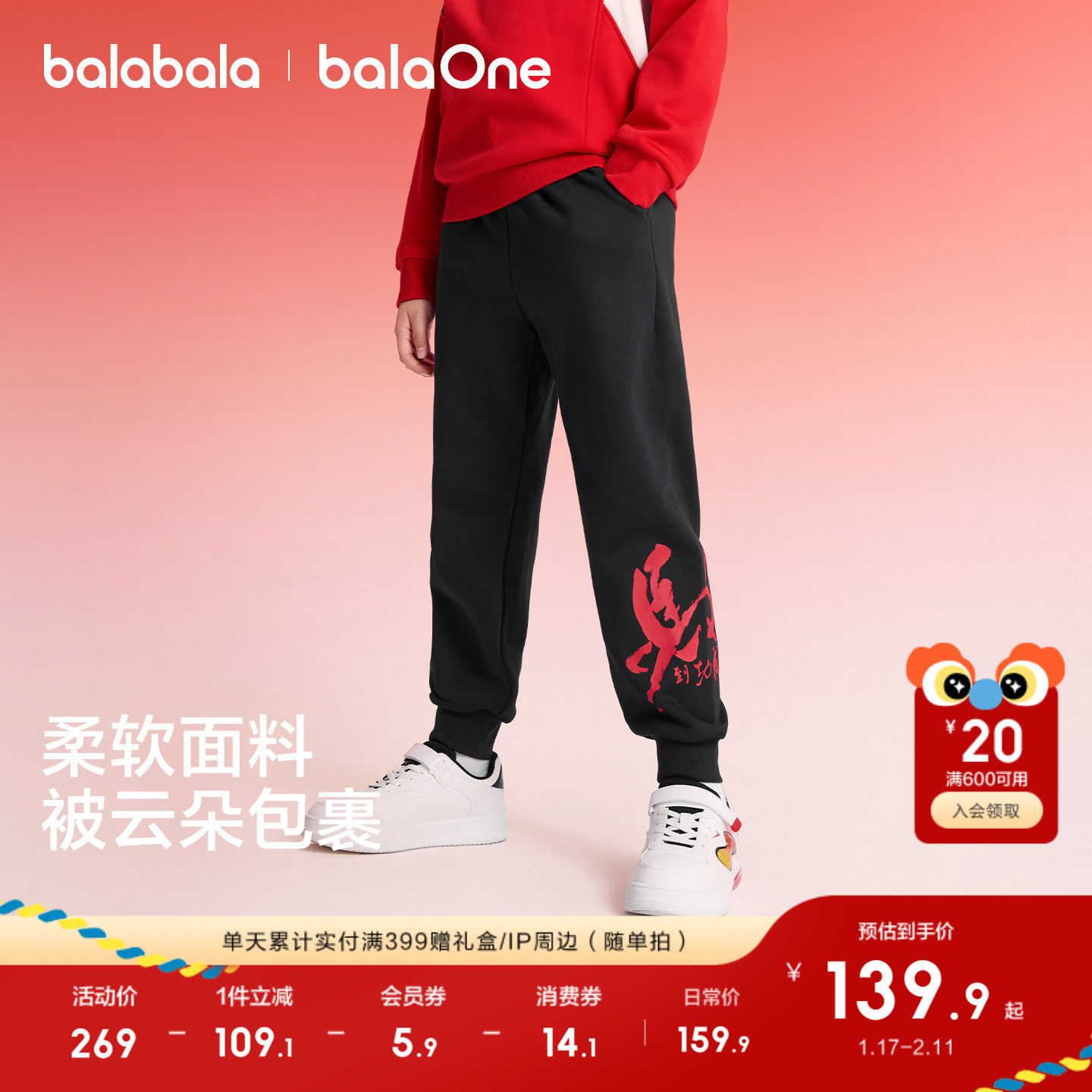 巴拉巴拉童装儿童拜年服裤子男童2026年新款春秋装加绒红色拜年服