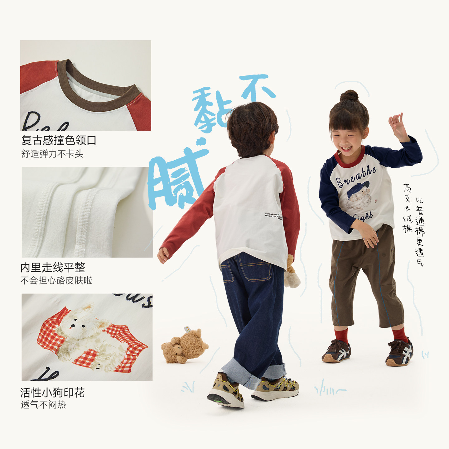 Q21久久棉儿童长袖T恤春秋款男女童60支棉撞色圆领长袖上衣打底衫