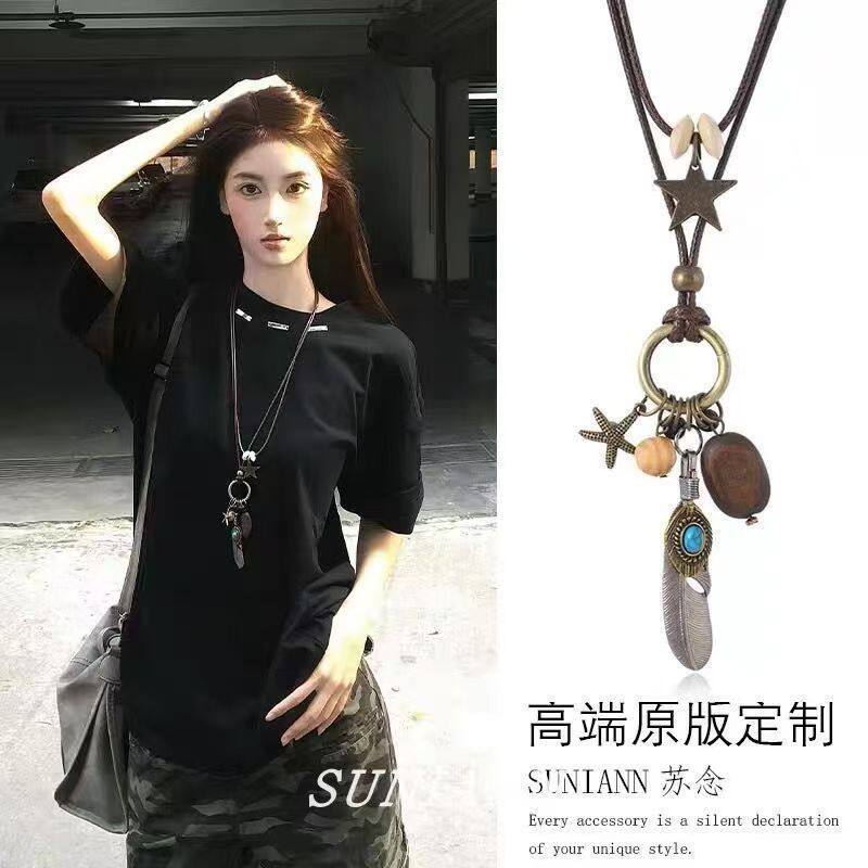 新中式复古长款羽毛项链女民族风高级装饰毛衣链波西米亚吊坠配饰