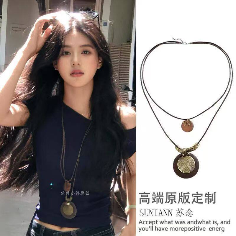 美拉德波西米亚叠戴毛衣项链女棕色复古穿搭choker锁骨链高级配饰