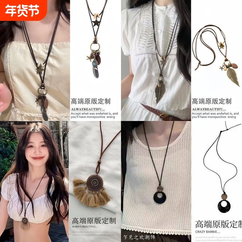 新中式复古长款羽毛项链女民族风高级装饰毛衣链波西米亚吊坠配饰