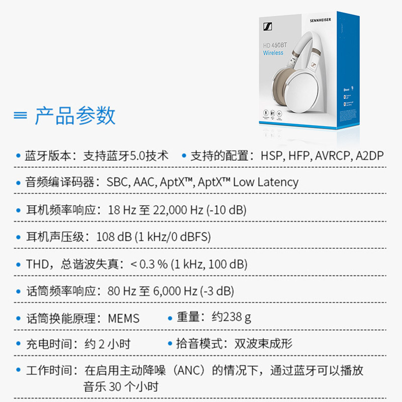 SENNHEISER/森海塞尔HD450BT蓝牙头戴无线运动耳机噪无线音乐1盒