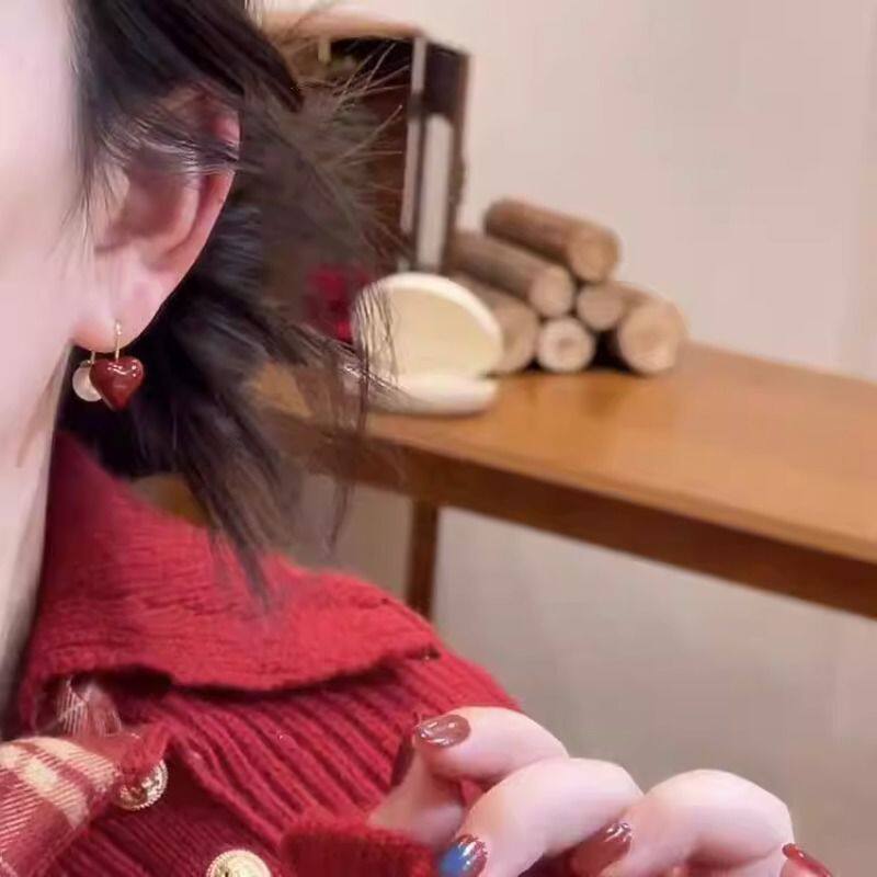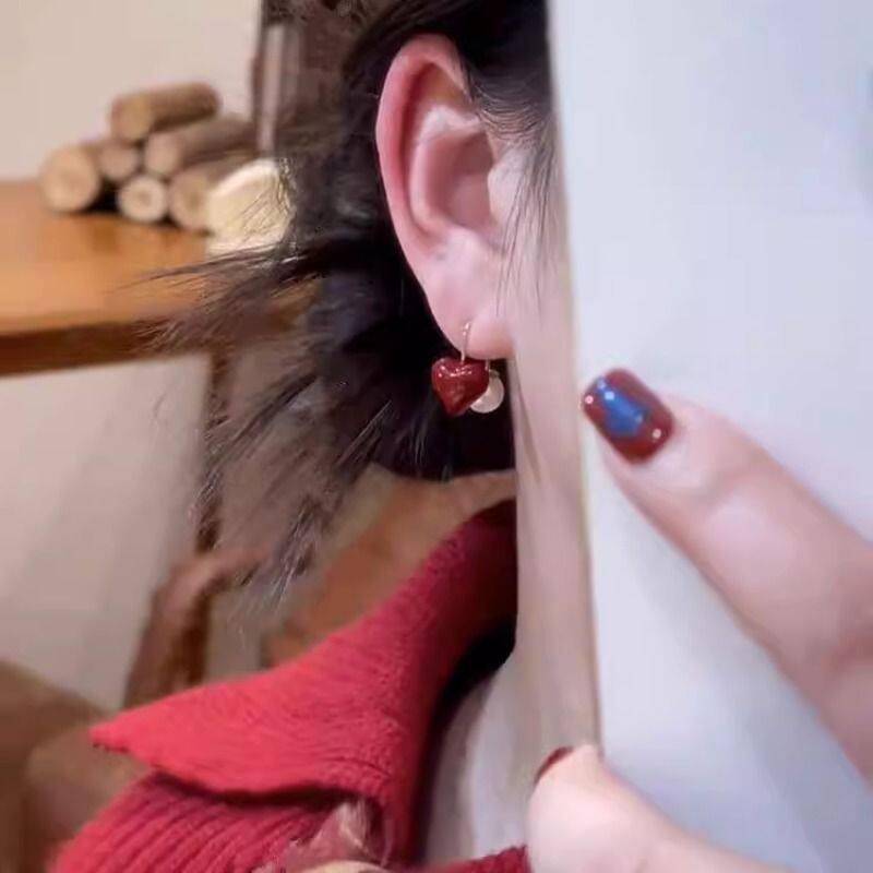 过年新年红色爱心珠珠耳环女2026新款爆款轻奢高级感气质简约耳饰