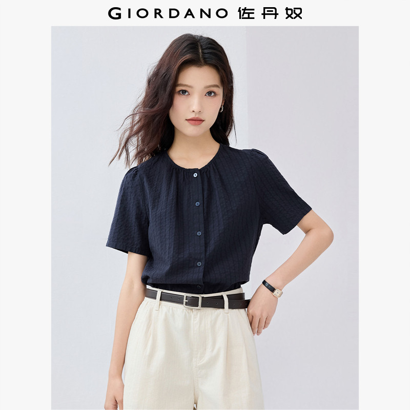 佐丹奴肌理感衬衫女新款纯棉暗条纹法式圆领通勤短袖上衣05345477