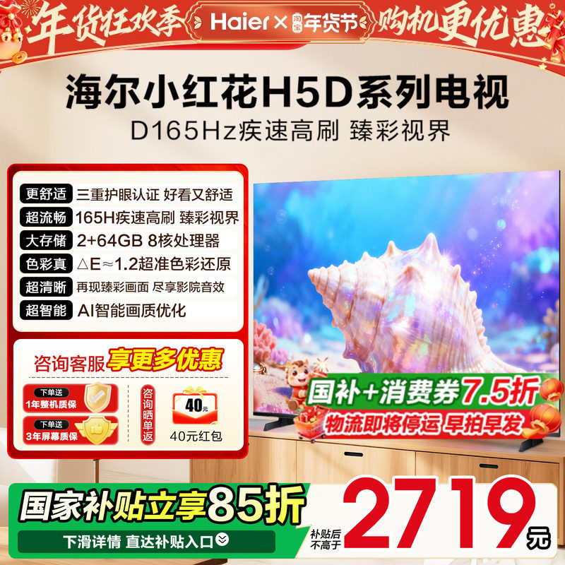 海尔小红花电视机75英寸H5D家用液晶55H5C以旧换新补贴2026新款