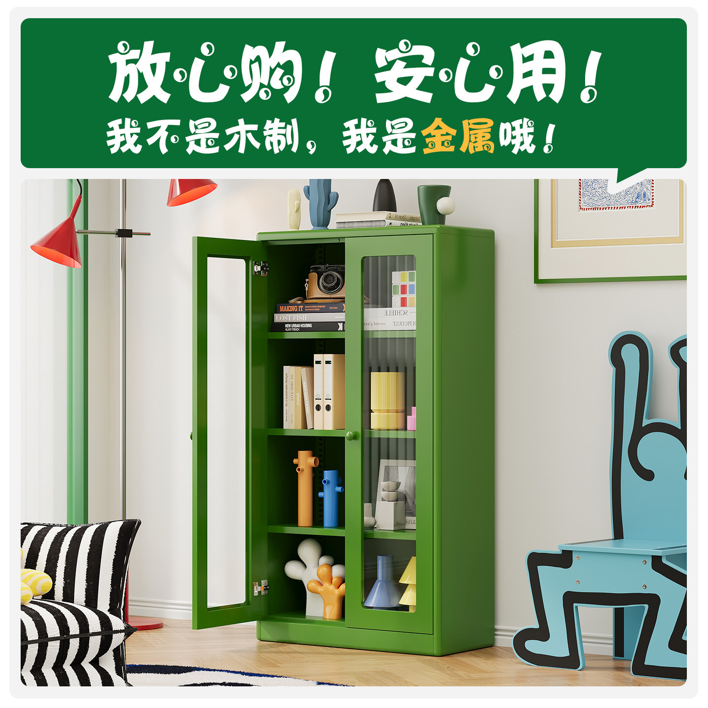 钢制书柜儿童书架落地家用客厅亚克力透明防尘门展示柜储物置物架