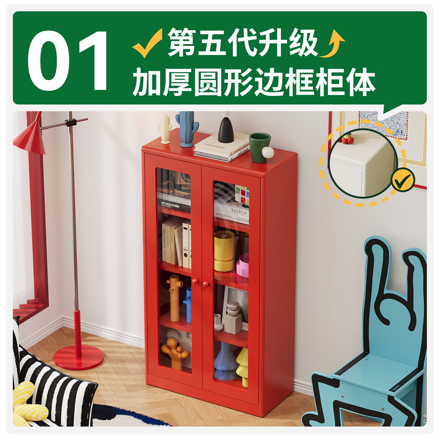 2025年新款圆角设计钢制无甲醛儿童书柜带门防尘书架学生卧室书橱
