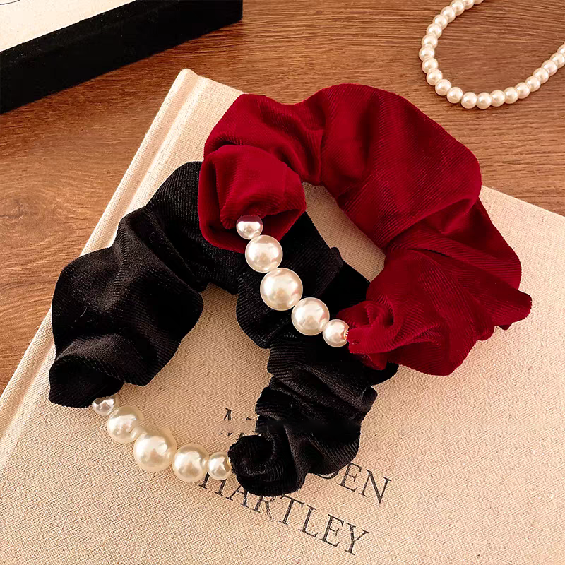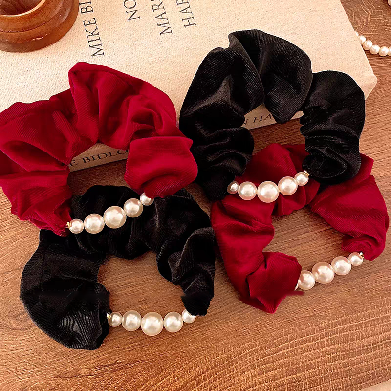 韩系红色珍珠大肠发圈头绳女高级感丸子头扎马尾发绳新年头花头饰