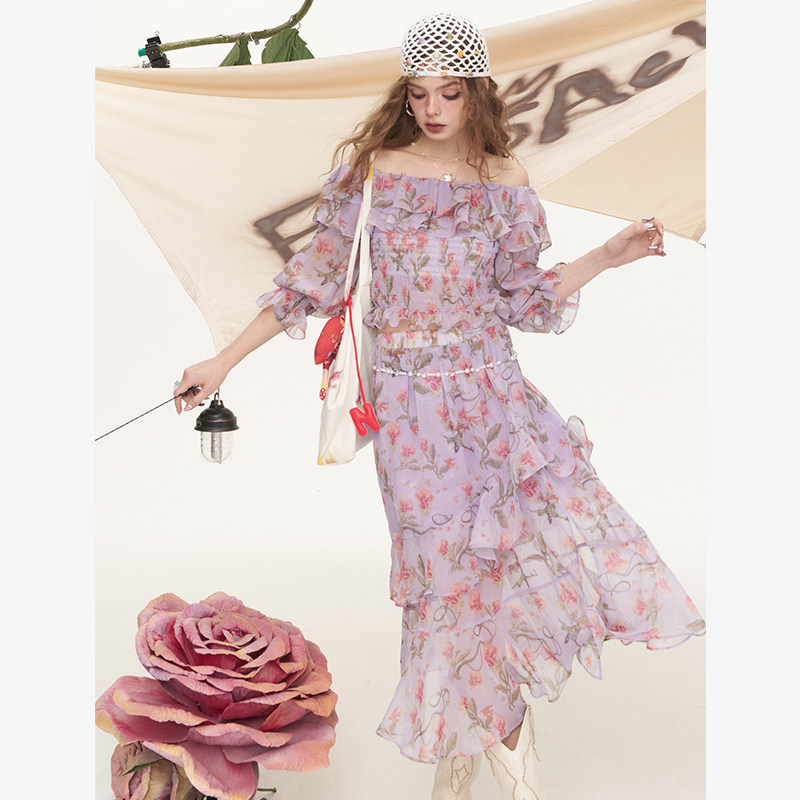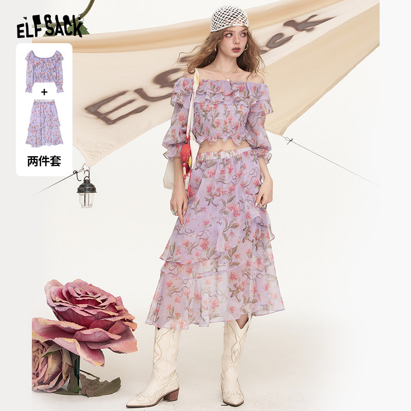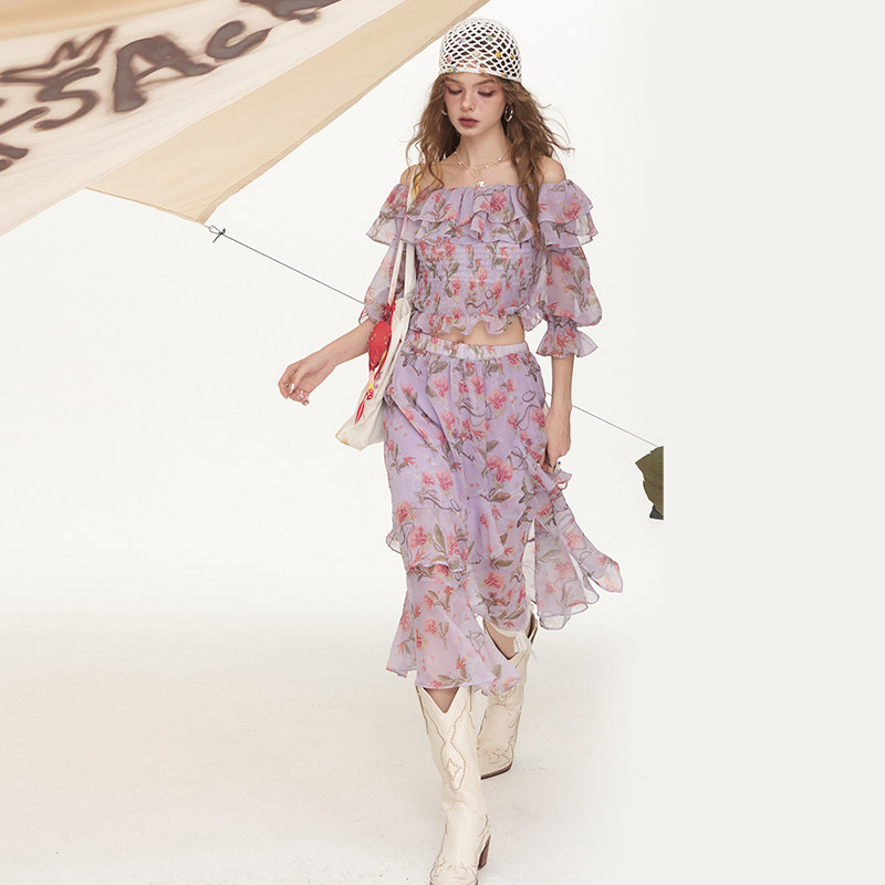 妖精的口袋碎花一字领雪纺衫半身裙两件套女2026新款夏日绝美套装