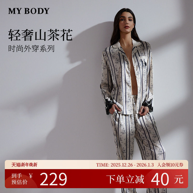 MYBODY商场同款睡衣女套装山茶花印花蕾丝袖长袖长裤可外穿家居服