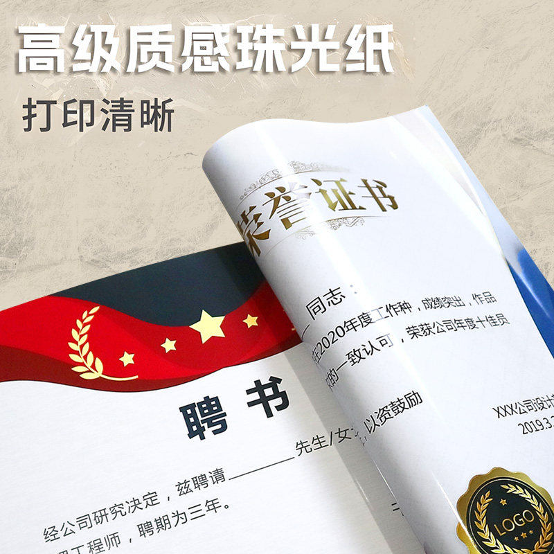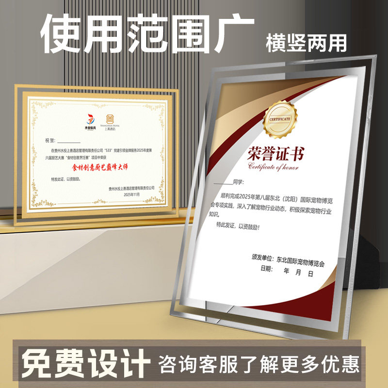 水晶玻璃荣誉证书框A4奖状定制内页专利授权书结业企业优秀员工毕业颁奖裱框A5聘书外壳12K相框架摆台打印