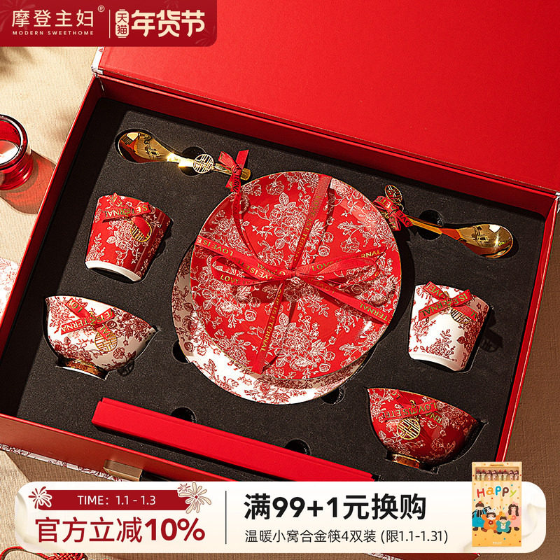 高档碗碟餐具陶瓷新婚礼物送新娘红色碗盘筷套装乔迁新居结婚礼盒