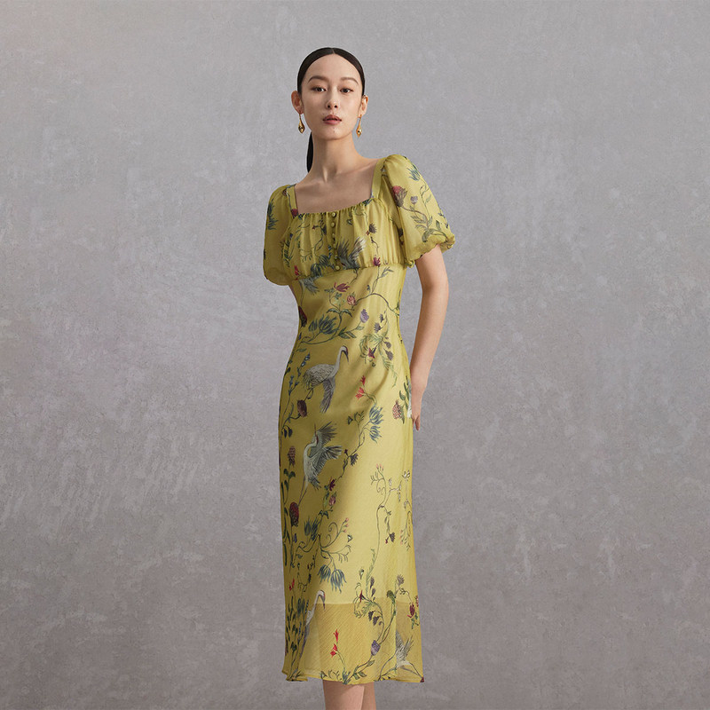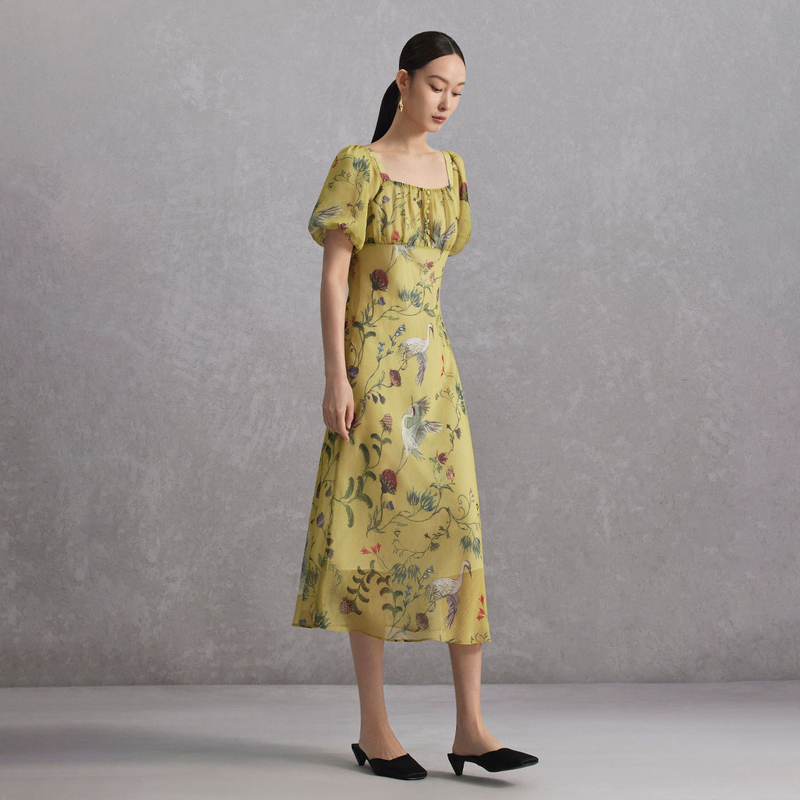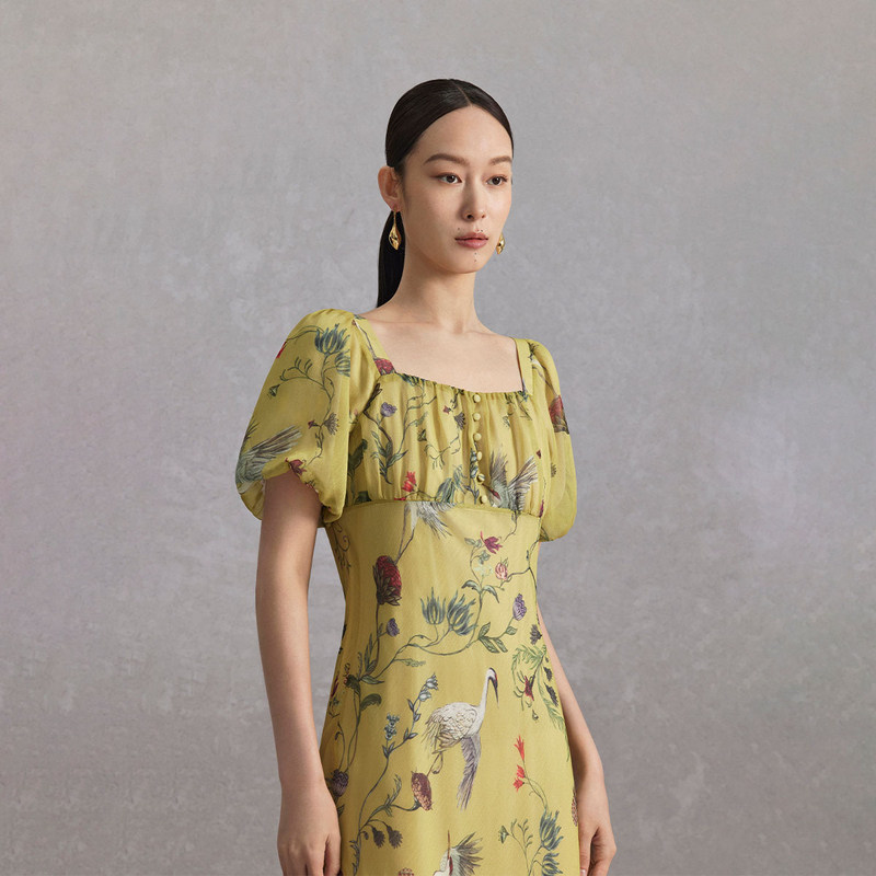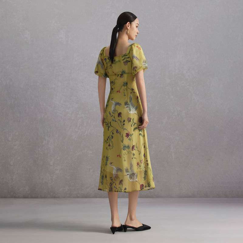 naivee纳薇夏国风高级新中式复古印花泡泡袖度假连衣裙