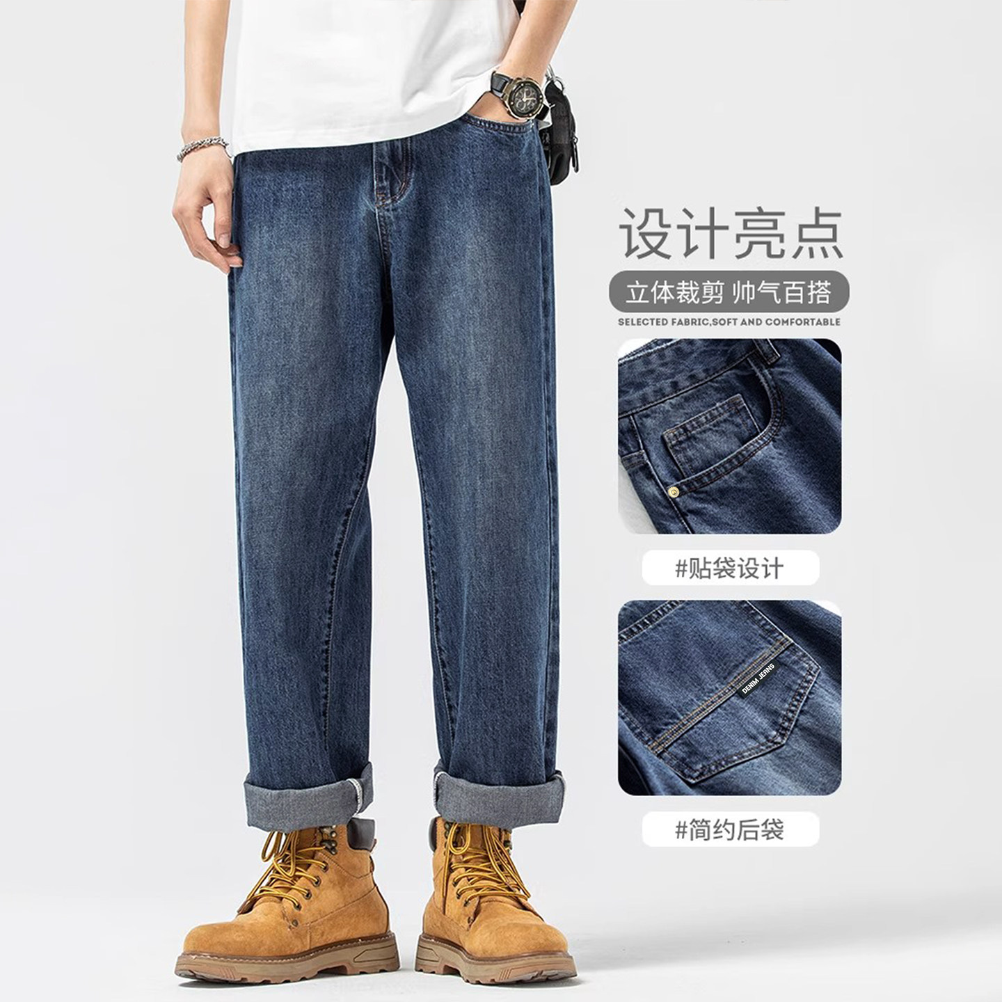 复古直筒牛仔裤男款春季宽松美式百搭裤子潮牌水洗做旧阔腿长裤子