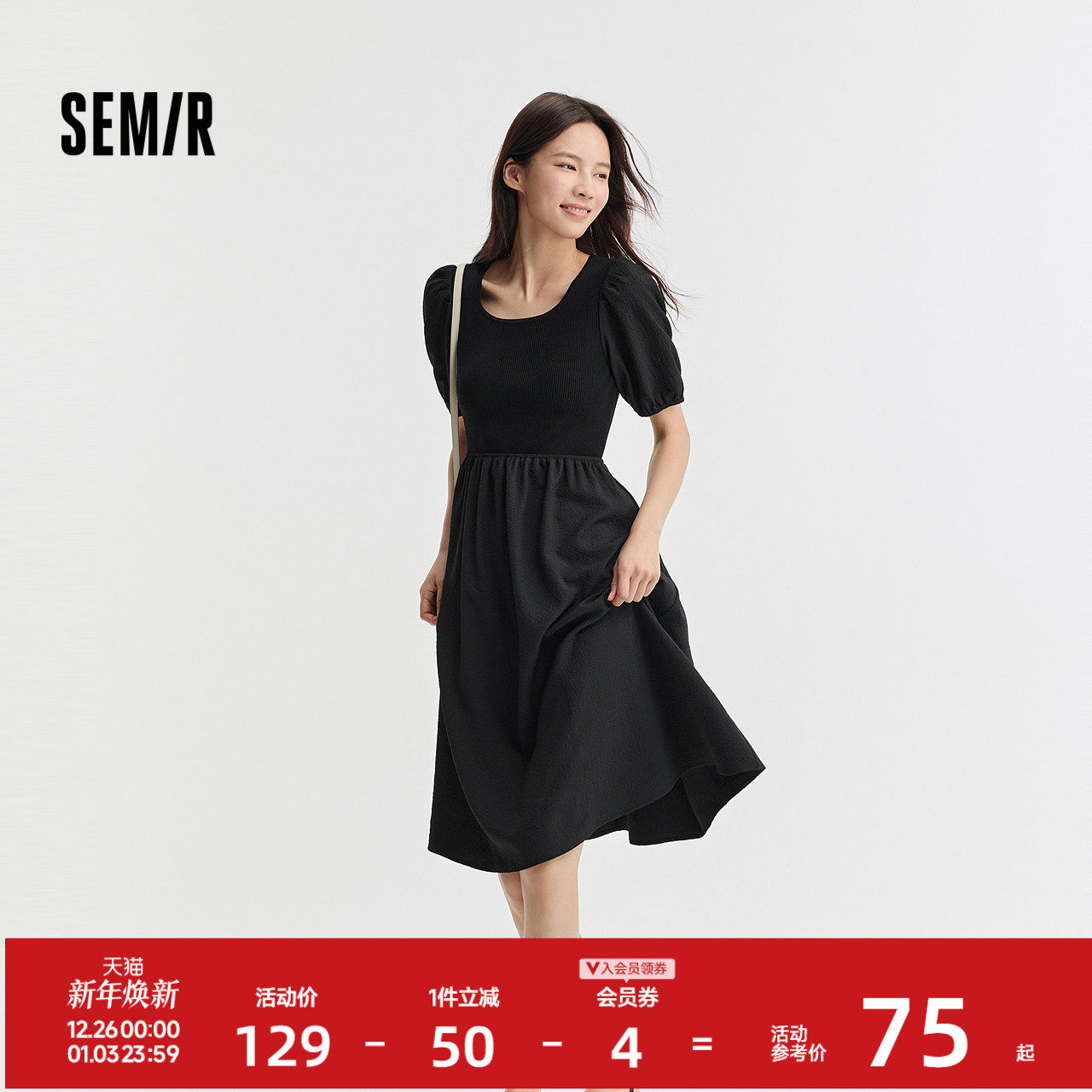 森马连衣裙女泡泡袖修身气质温柔夏季百搭拼接收腰肌理中长裙优雅