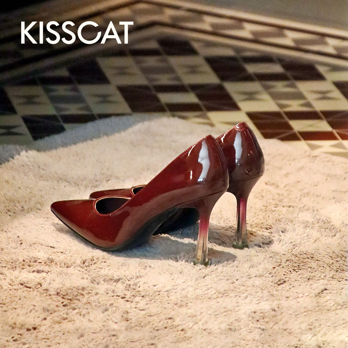 KISSCAT接吻猫[微醺舞曲]高跟鞋秋新气质红色高跟鞋尖头浅口单鞋