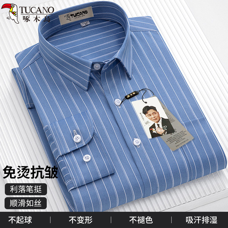啄木鸟男士蓝色长袖衬衫经典条纹商务免烫春夏休闲有口袋薄款寸衣