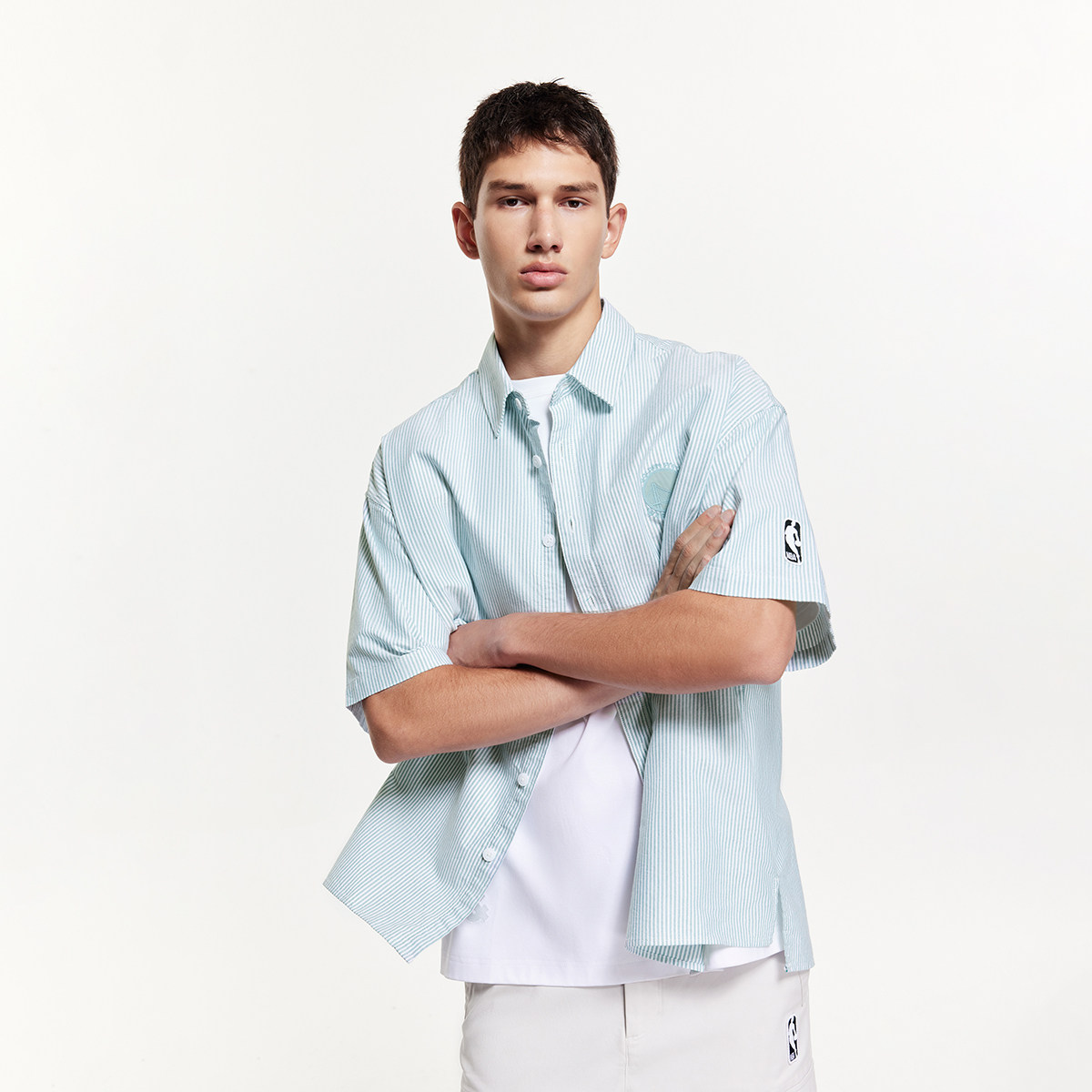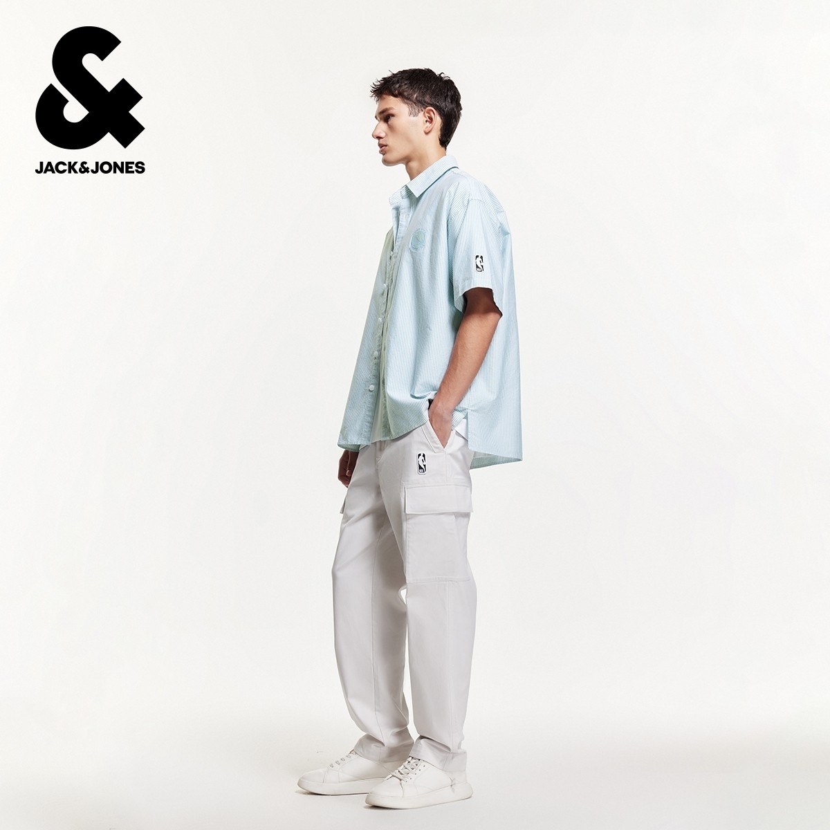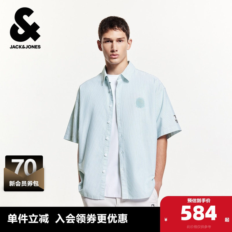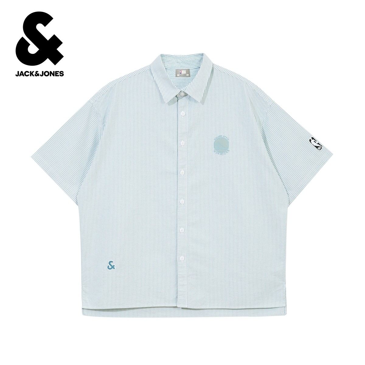 杰克琼斯男装秋季NBA联名精致刺绣条纹纯棉日常休闲短袖衬衫上衣