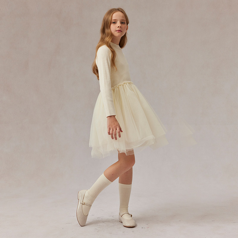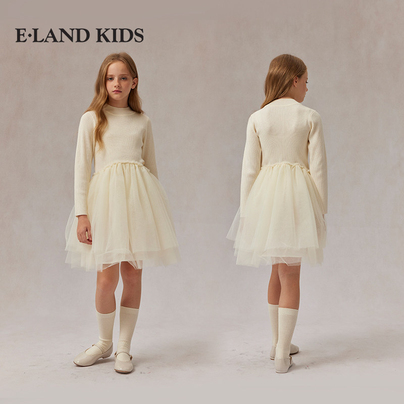 eland kids衣恋童装女童连衣裙春秋季休闲圆领针织拼接网纱裙子