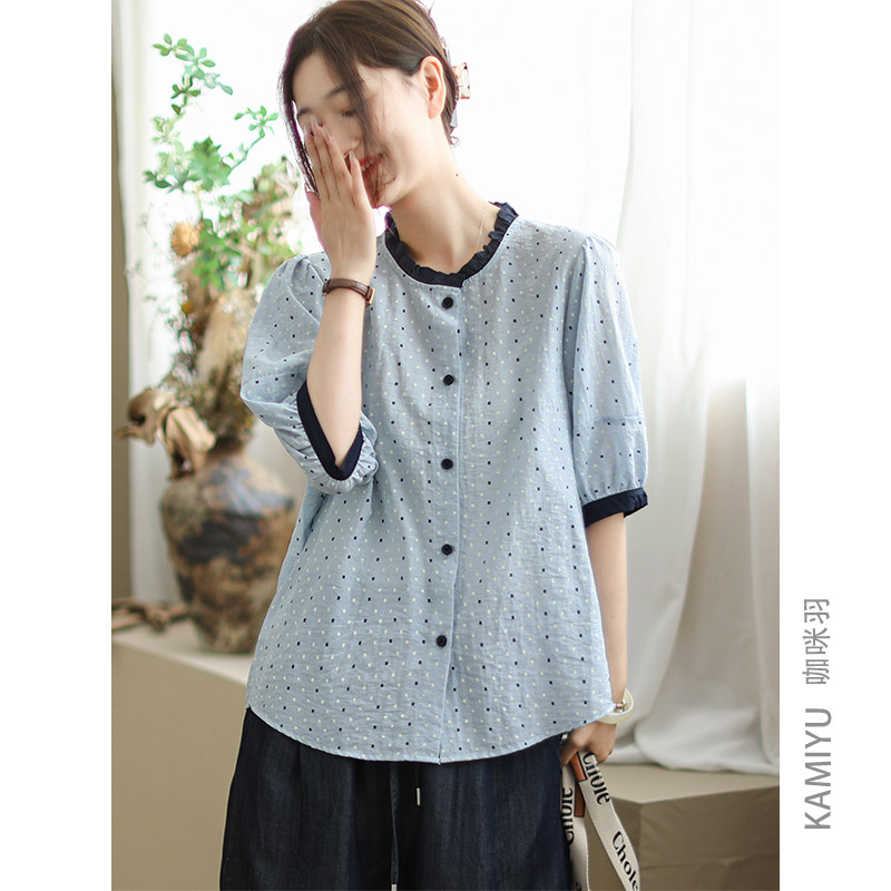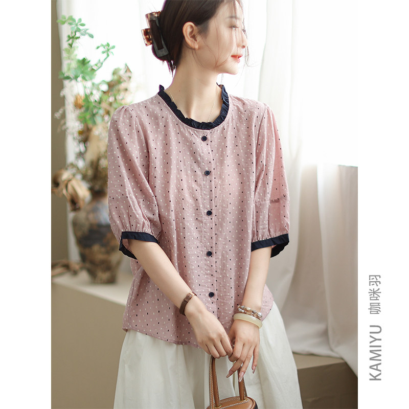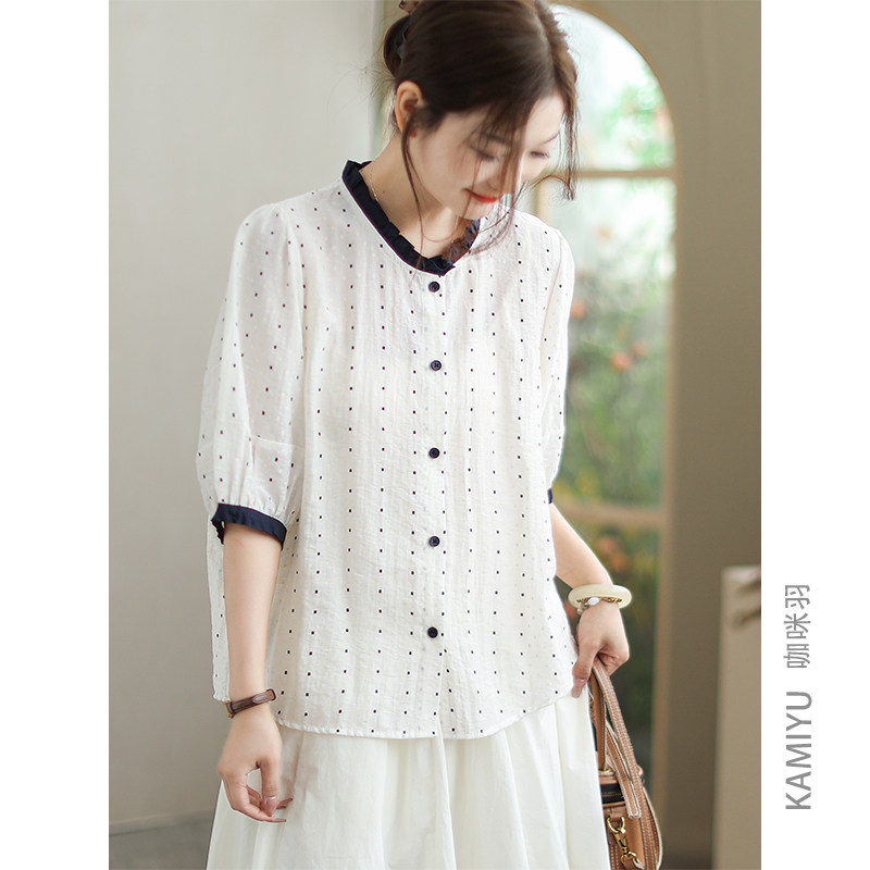 咖咪羽衬衫短袖女夏季2025新款时尚女士棉麻薄款宽松印花女装T恤
