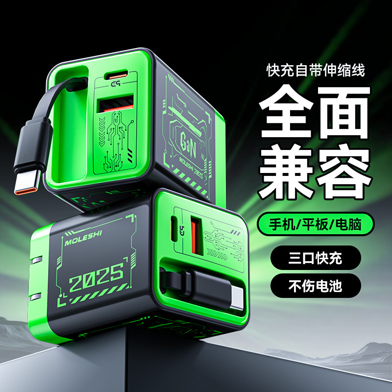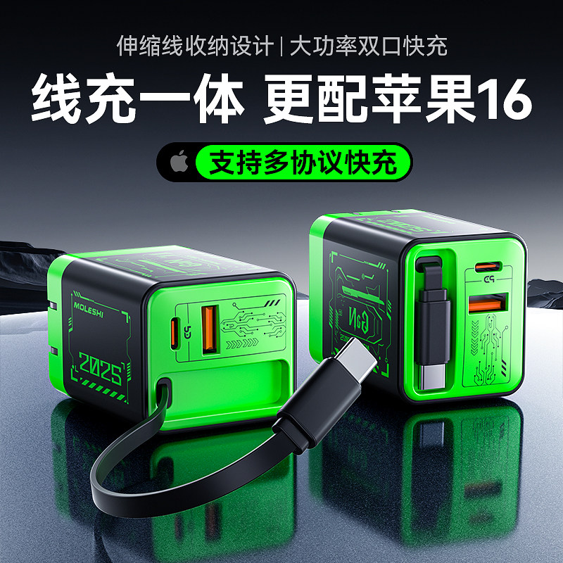 氮化镓充电器自带伸缩线充电头iPhone16快充Typec插头usbc多口适用华为苹果小米oppovivo手机电脑笔记本平板