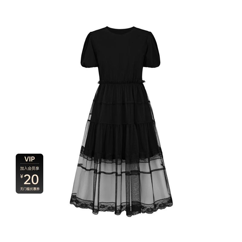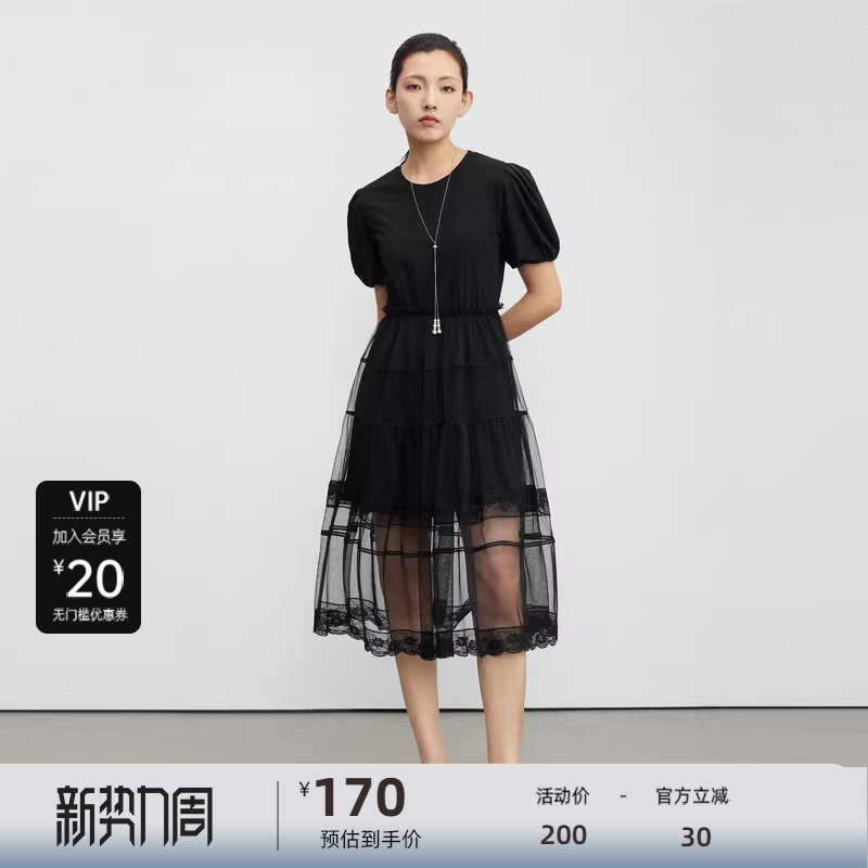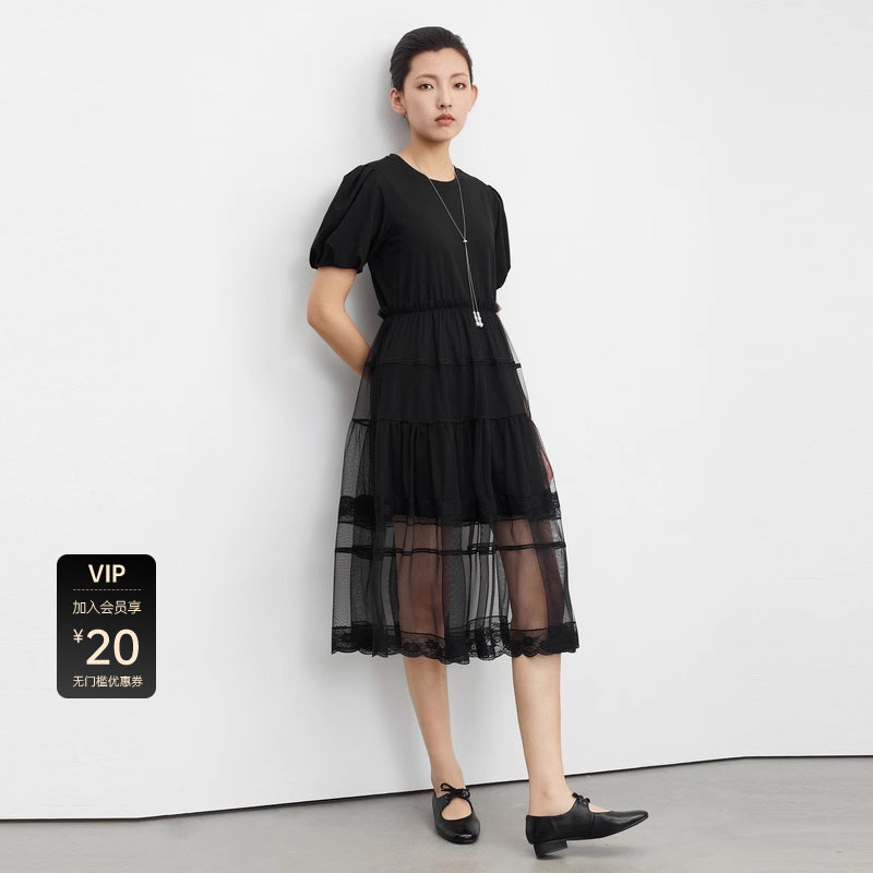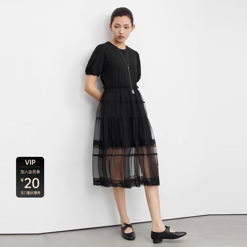 S·DEER圣迪奥女装圆领网纱蕾丝泡泡袖连衣裙S23261204