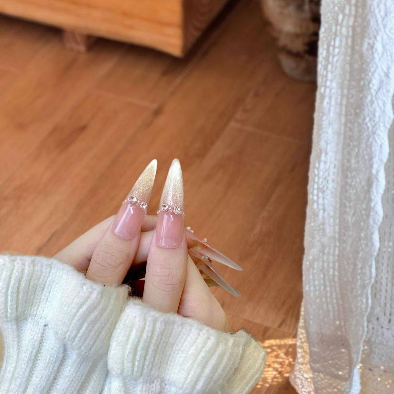 4.0细狗长尖穿戴甲爆闪金色猫眼爱心镶钻ins百搭学生显白手工美甲