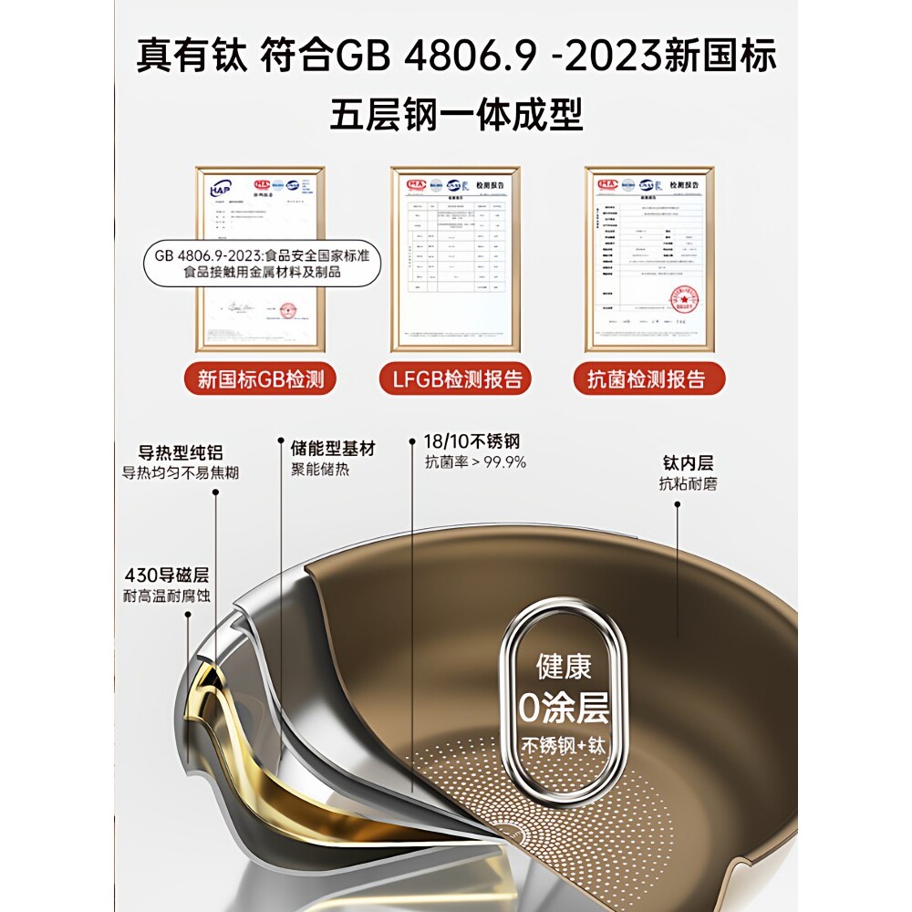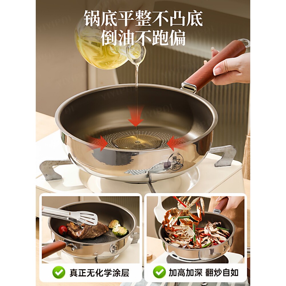 德国有钛316L不锈钢无涂层平底锅煎锅不粘锅家用聚油炒菜锅电磁炉