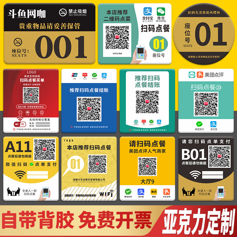 扫码点餐二维码桌贴亚克力桌号扫一扫订做餐厅饭店美团微信点单桌牌点菜贴纸定制数字桌面号码收钱标识牌打印