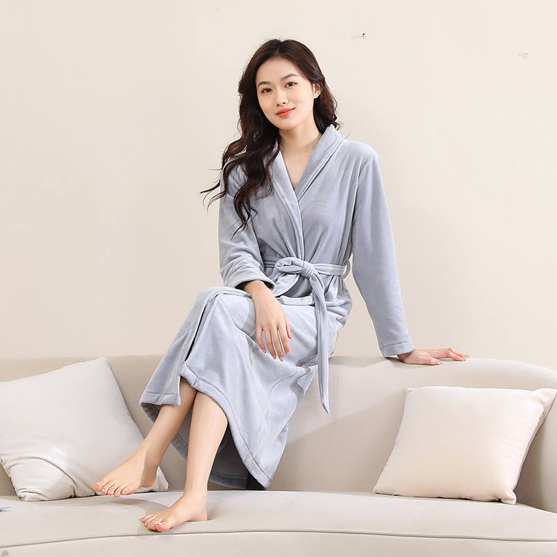 网红同款秋冬睡袍男过膝简约系带浴袍女加绒保暖洗澡珊瑚绒浴衣