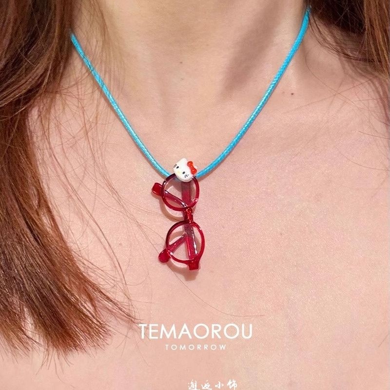 可爱kitty猫红框眼镜吊坠天蓝色蜡项链女童趣趣味长款装配品配饰