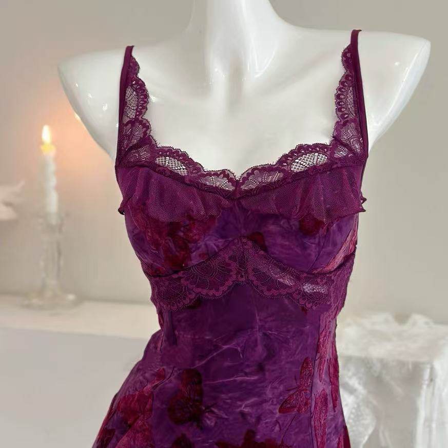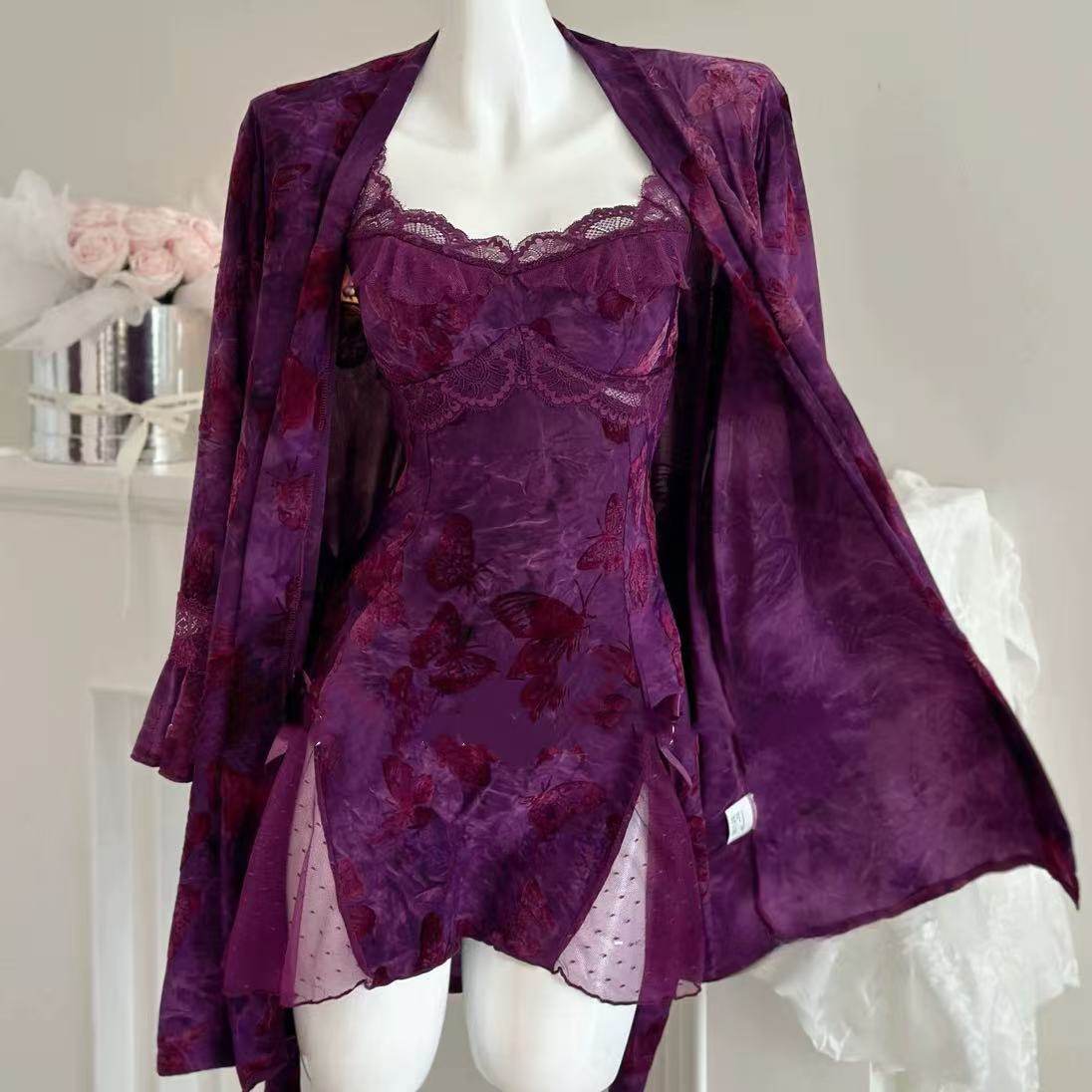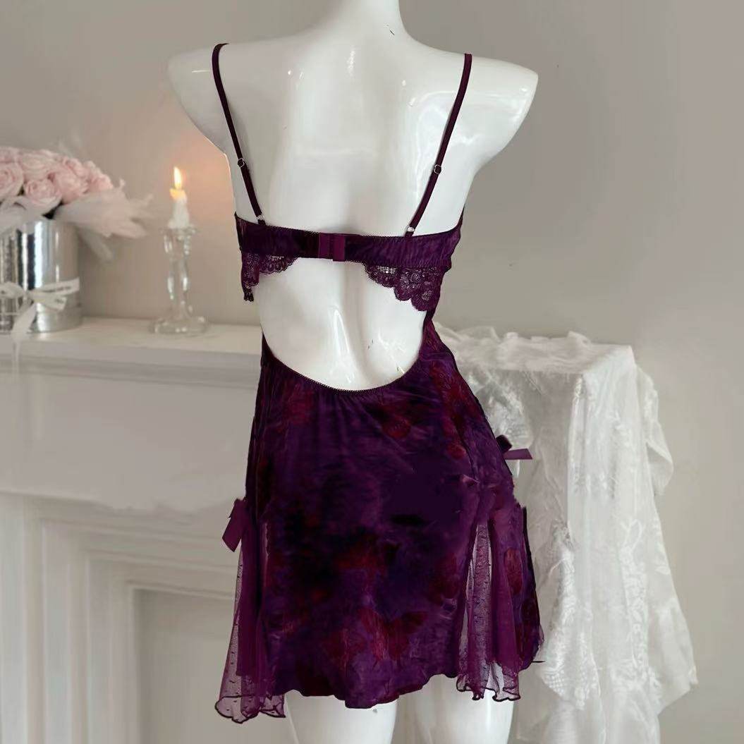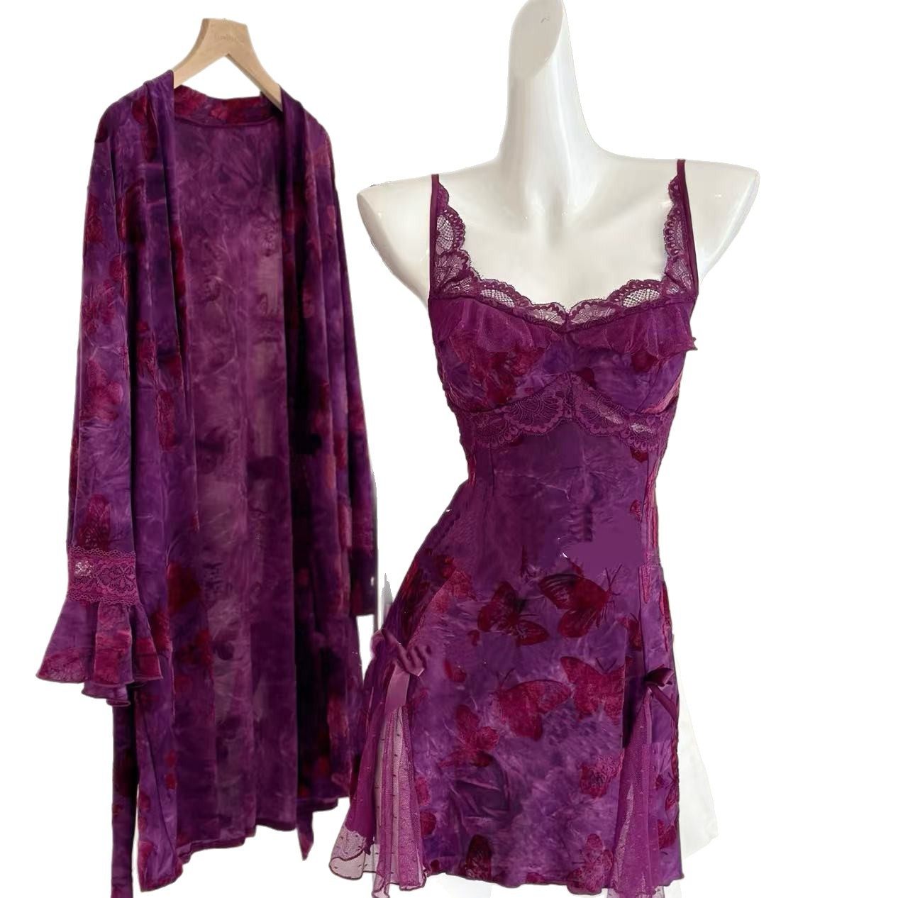 DZ性感蝴蝶蕾丝加胸垫深V诱惑挂脖吊带睡裙外袍家居套