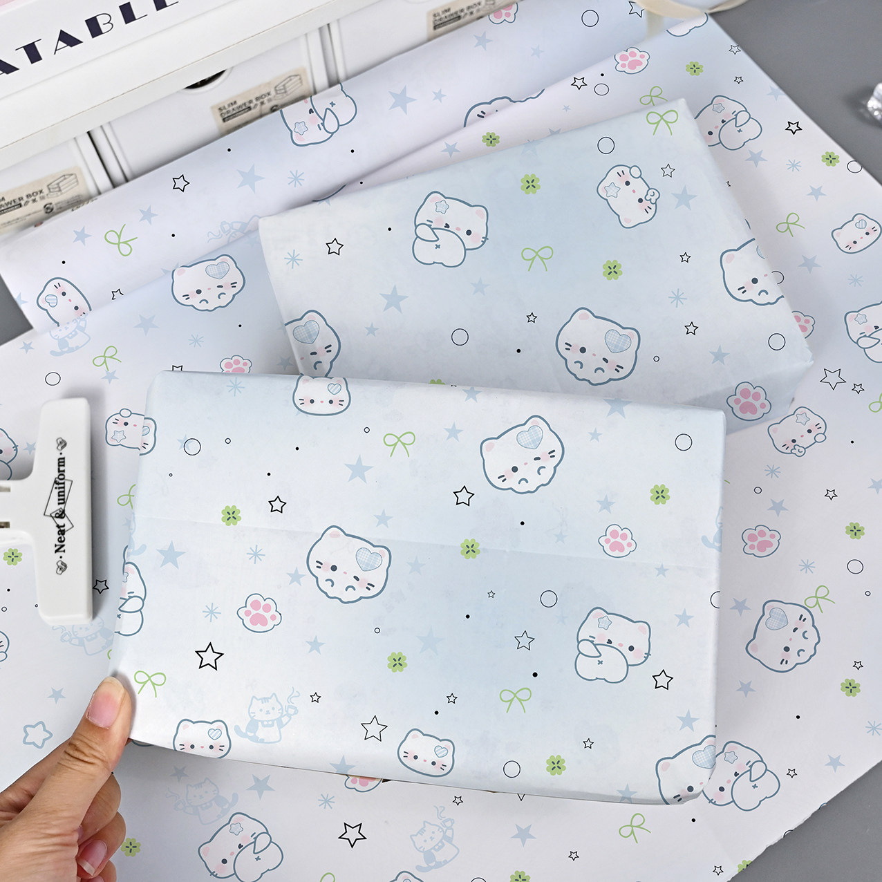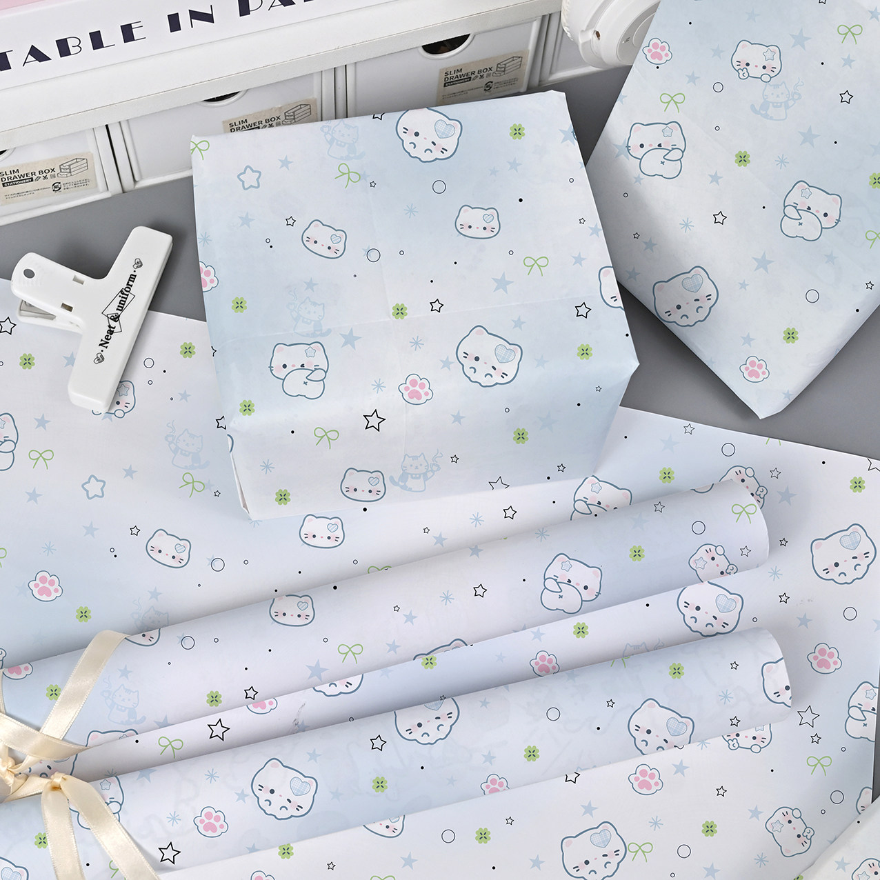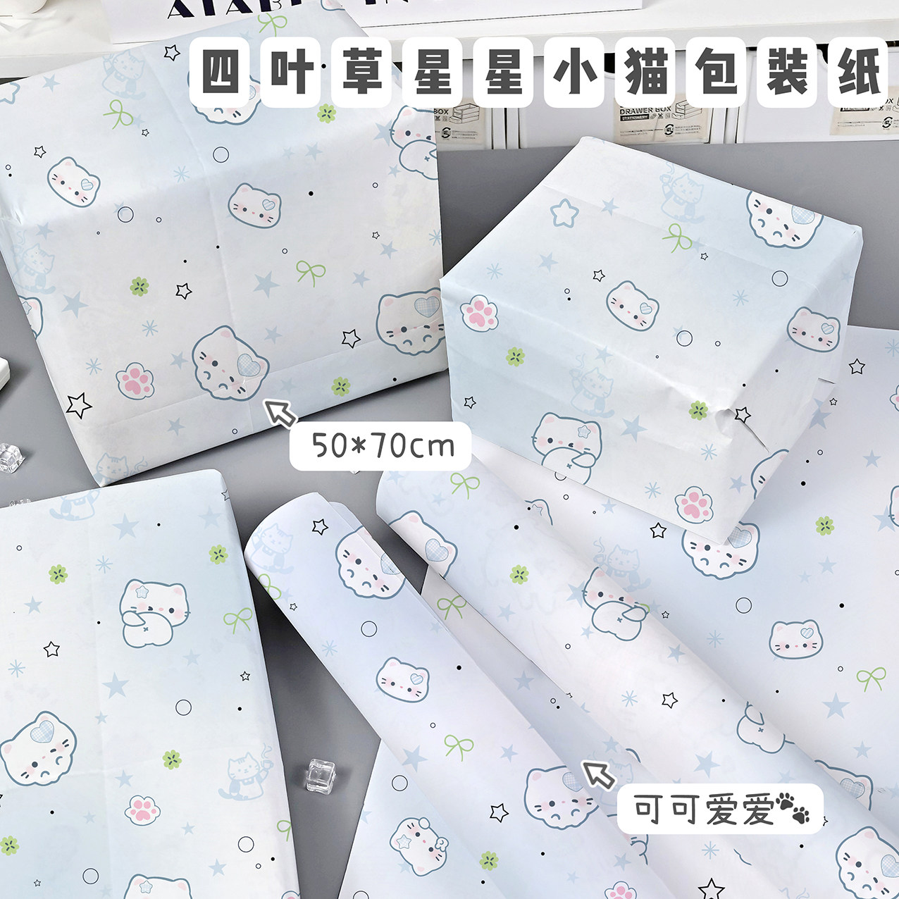 新款四叶草星星小猫礼物纸白色印花大尺寸可裁剪礼品包装纸高颜值